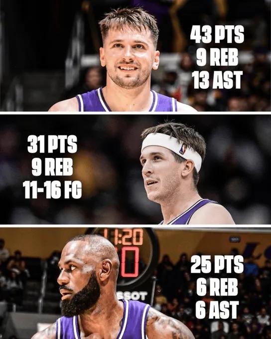 湖人这三巨头的进攻火力历史都独一档,根本没办法阻挡啊,所以第四节你能看到快船直接投降!里弗斯得到31分9篮板3助攻3抢断。詹姆斯25分6篮板6助攻1抢断1封盖。东契奇得到43分9篮板13助攻1抢断1封盖,东契奇28中14,里弗斯16中11,詹姆斯15中9,三个人投进了全队,13个3分球中的11个。