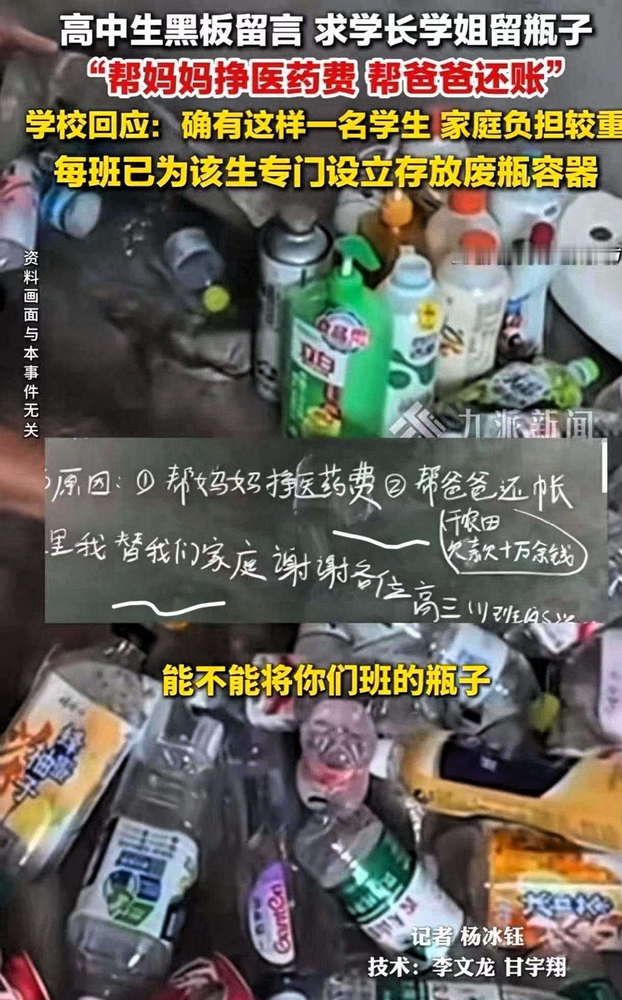 看哭了!高二男生黑板上的留言,字字戳中人心。 “请学生会看到不要扣分”,先惦记着不给班级添麻烦,再小心翼翼恳请学长学姐把空瓶子留给自己——背后是妈妈重病、家里欠着十万外债的艰难处境。 十几岁的年纪,本应无忧无虑,他却想着用收废品的微薄收入,帮爸爸还债、给妈妈凑医药费。没有抱怨,没有怯懦,只剩少年沉甸甸的担当。 老师和同学们的举动同样暖心,每个班级都专门准备了纸箱或水桶存放瓶子,用无声的善意守护着这份自尊。 小小的身躯扛起家庭重担,这份责任感远比成绩更珍贵。愿男生的妈妈早日康复,也相信这份逆境中的坚强,终将照亮他的未来。你被这份少年担当打动了吗?