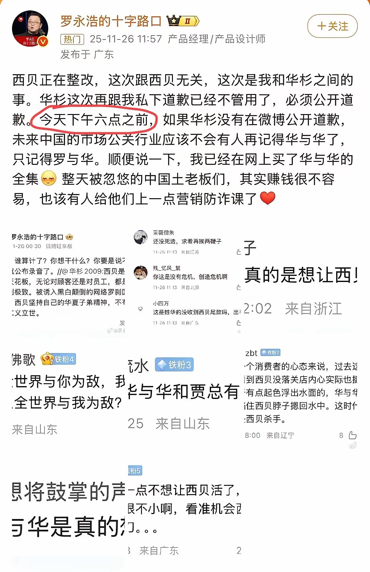 这都六点多了华与华向罗永浩道歉了吗?看来这次华与华不私下付出让罗永浩满意的代价,就很难收场了。 说实话,目前这种架式华与华跟罗永浩都被架到火上了,如果华与华道歉了,那以后开展业务也难了;如果不道歉,罗永浩要是真有他们见不得人的录音或者其它把柄,那华与华就会很惨了。 华与华快决定吧!吃瓜群众都在等着看戏呢!