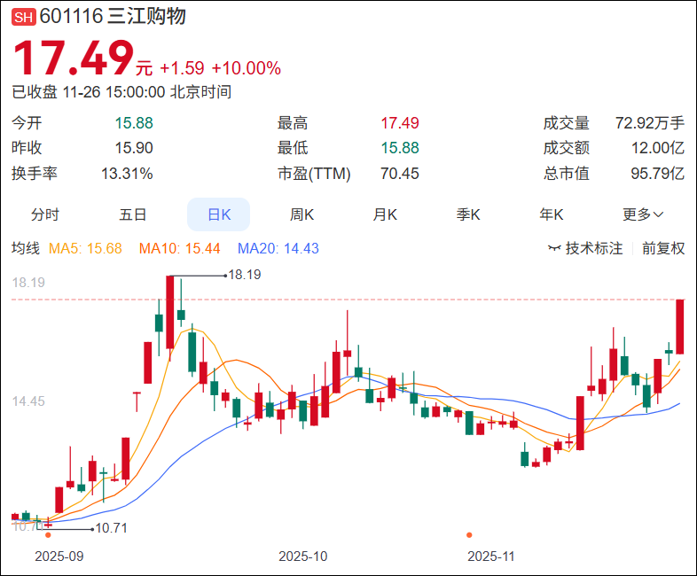 宁波生鲜超市龙头三江购物26日晚间发布公告称,公司股票于2025年11月24日、11月25日和11月26日连续三个交易日内收盘价格涨幅偏离值累计超过20%,属于股票交易异常波动。截至26日收盘,三江购物股价再次涨停,最近三个交易日出现两个涨停板,最新价报17.49元/股。