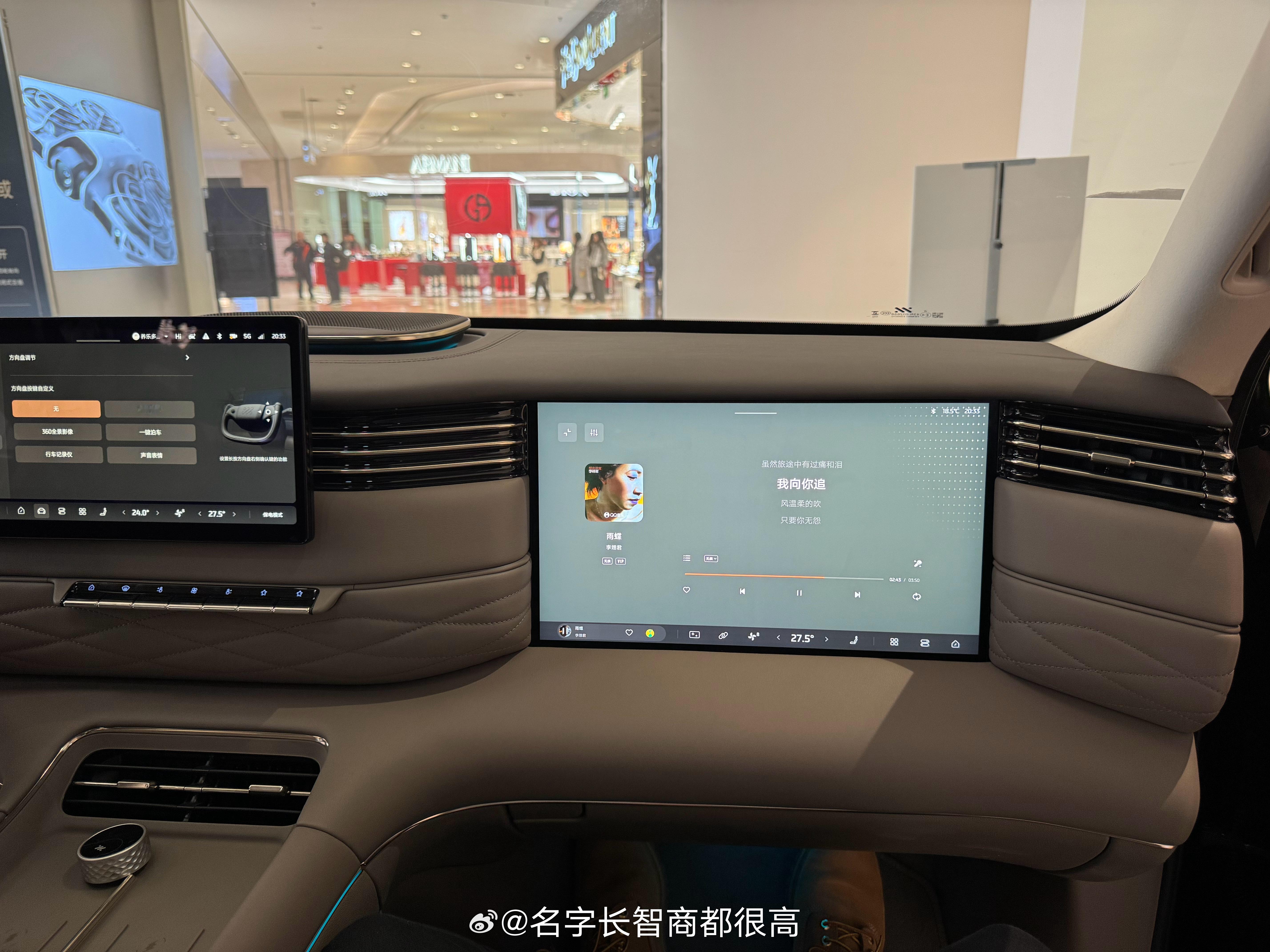 现在市面上有不少“9系”全尺寸三排座SUV,但屏幕布置各有千秋,我仍然坚持认为理想L9带来的那一套中央副驾大连屏是更优的解决方案。刚才在商场体验了一下智己LS9,它搭载的是仪表和中控连屏配合副驾低位大屏幕,实际体验下来,效果是灾难的。首先,仪表位屏幕受方向盘遮挡实际观感很难受,其次,副驾前面的屏幕位置很低,即使副驾座椅调至最低也需要低头观看屏幕,看了时间长肯定是会疲惫的。