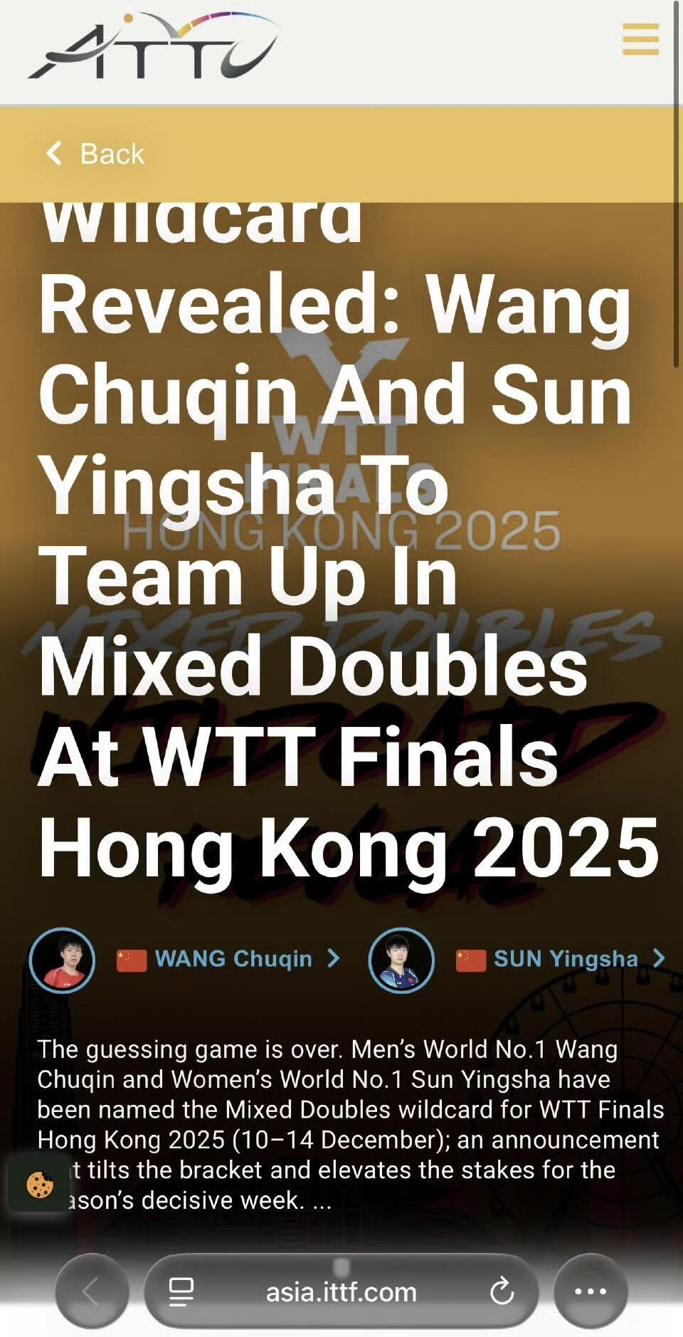 孙颖莎王楚钦混双拿到了香港总决赛的外卡。 香港总决赛的外卡还是给了孙颖莎王楚钦