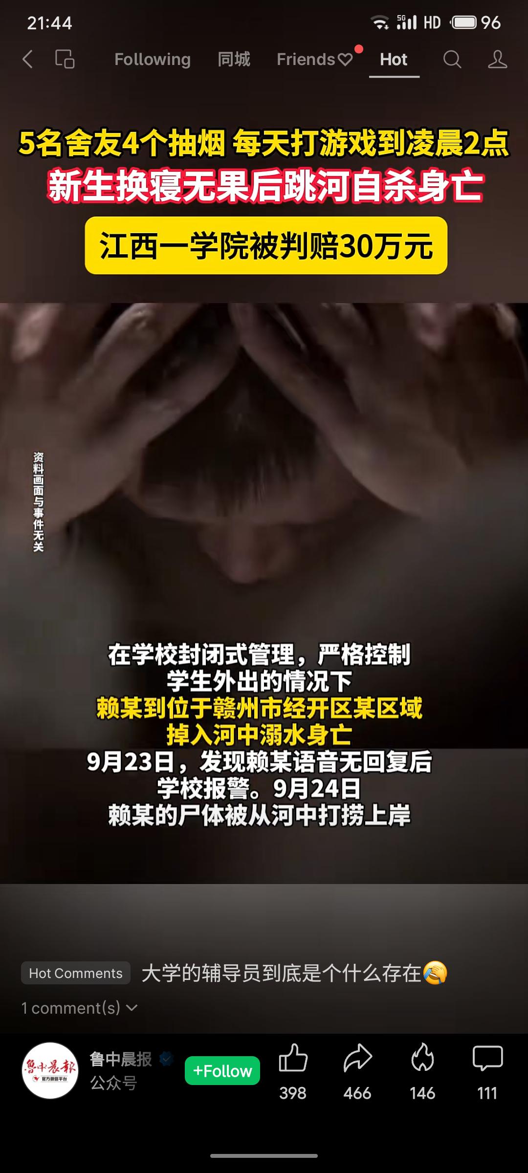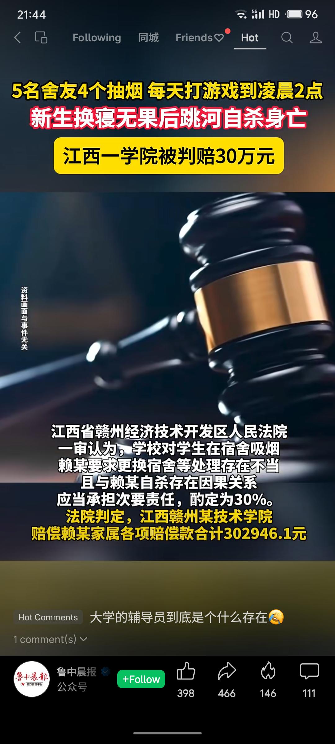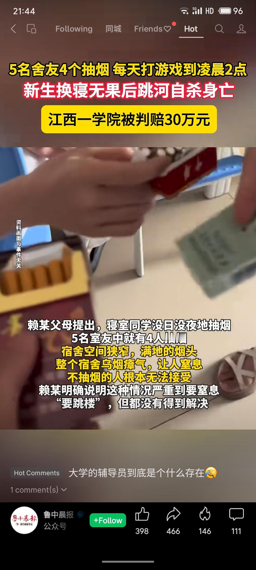 江西某学院一名新生因无法忍受宿舍内四名室友长期抽烟、通宵游戏至凌晨的恶劣环境,多次向辅导员申请换寝未果后,跳河自杀身亡。法院一审认定,学校在处理学生吸烟及换宿请求中存在不当,与悲剧发生存在因果关系,应承担次要责任(30%),判决该学院向死者家属赔偿共计约30.3万元。