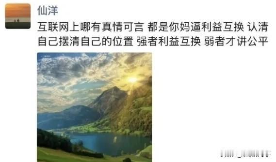 仙家家洋发朋友圈爆粗泄愤! 昨天报道仙家洋封号6小时,虽在群内发声呼吁粉丝低调求稳,但仍有部分“仙家”粉将矛头指向刘二狗。 清晨仙家洋发了一条朋友圈,怒斥互联网无真情全是利益交换,认清摆正自己的位置!(不知指向何人)
