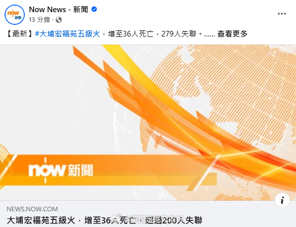11月27日凌晨1点18分,NOW新闻消息,香港大埔火灾,增至36人死亡,超过270人失联!香港已有数百名居民登记家属失联
