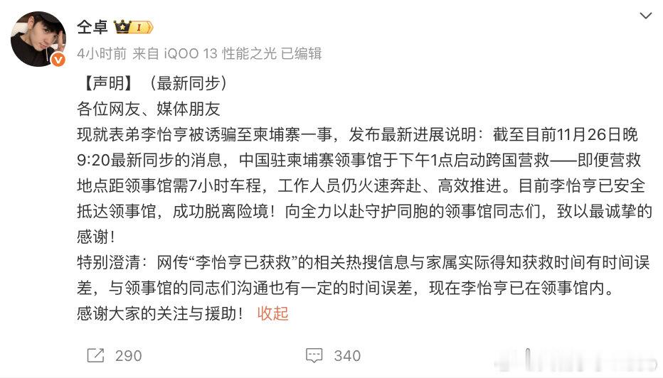 【仝卓感谢领事馆】仝卓致谢 11月26日晚间,更新声明:截至目前11月26日晚9:20最新同步的消息,中国驻柬埔寨领事馆于下午1点启动跨国营救——即便营救地点距领事馆需7小时车程,工作人员仍火速奔赴、高效推进。目前李怡亨已安全抵达领事馆,成功脱离险境!向全力以赴守护同胞的领事馆同志们,致以最诚挚的感谢!特别澄清:网传“李怡亨已获救”的相关热搜信息与家属实际得知获救时间有时间误差,与领事馆的同志们沟通也有一定的时间误差,现在李怡亨已在领事馆内。感谢大家的关注与援助!仝卓表弟已抵达中国驻柬使馆