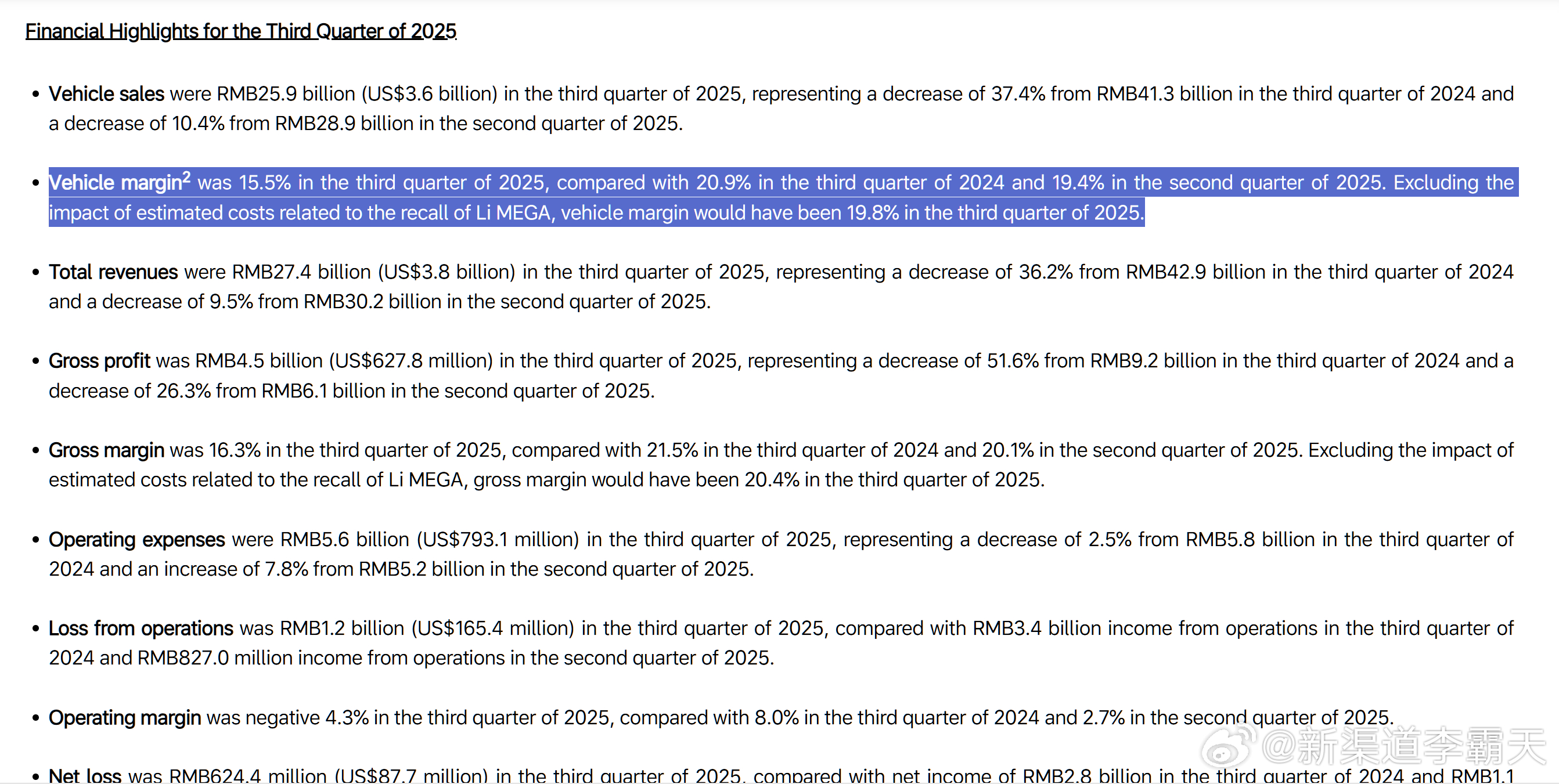 理想出现单季度净亏损了,为什么?核心原因还是MEGA的召回(图1)召回对汽车业务毛利率的影响很大,直接拉低 4.3 个百分点,导致汽车毛利率降至 15.5%—— 这一影响对应的召回相关费用约为 11.1 亿元;若剔除召回因素,汽车业务毛利率本可达到 19.8%。单季度亏损6.2亿(图2),如果没有召回,净利润还是差不多有5个亿的。不过为了用户的安全和品牌口碑,这11个亿还是值得花。理想汽车发布三季度财报 理想汽车 理想汽车Q3财报