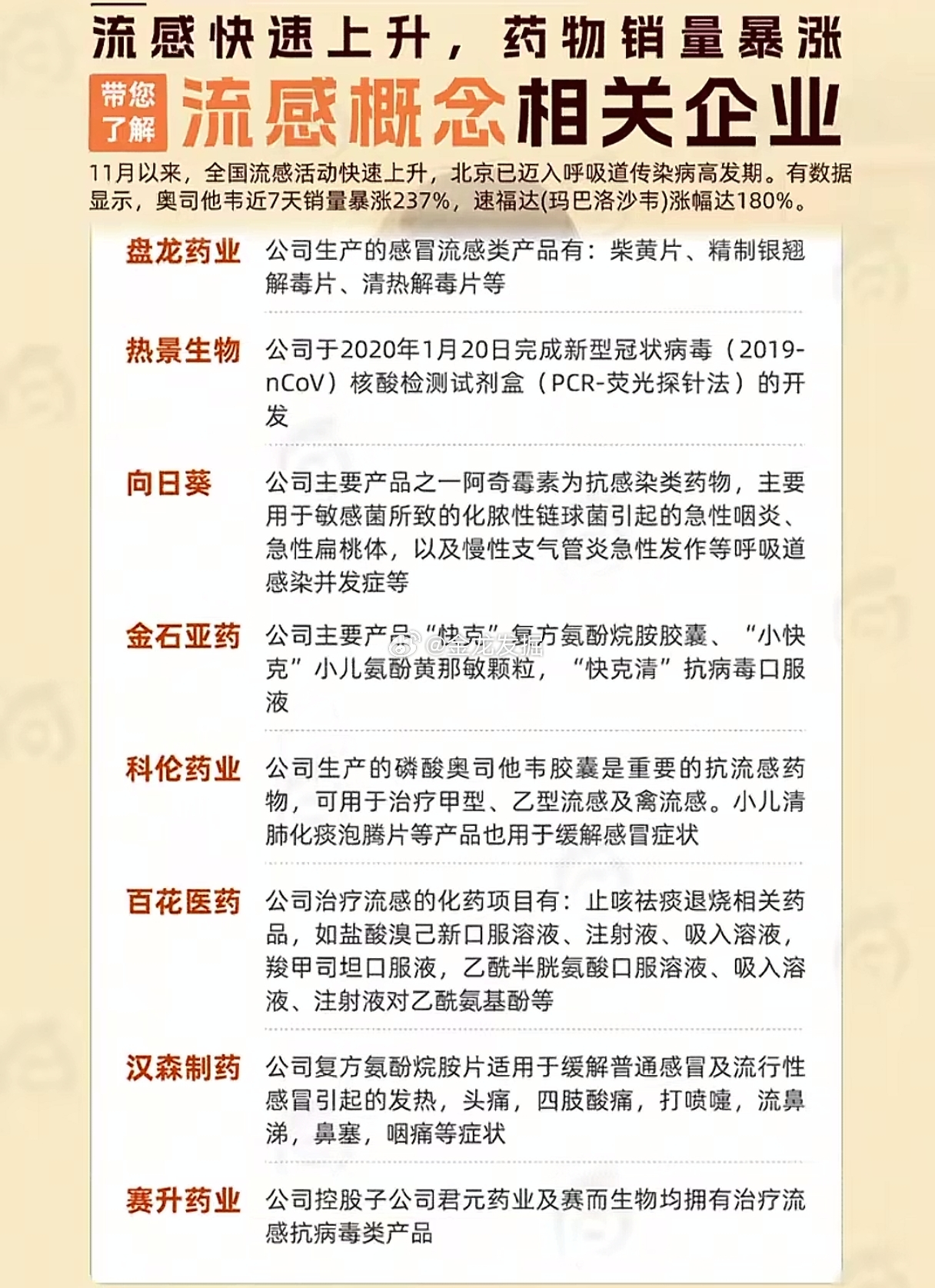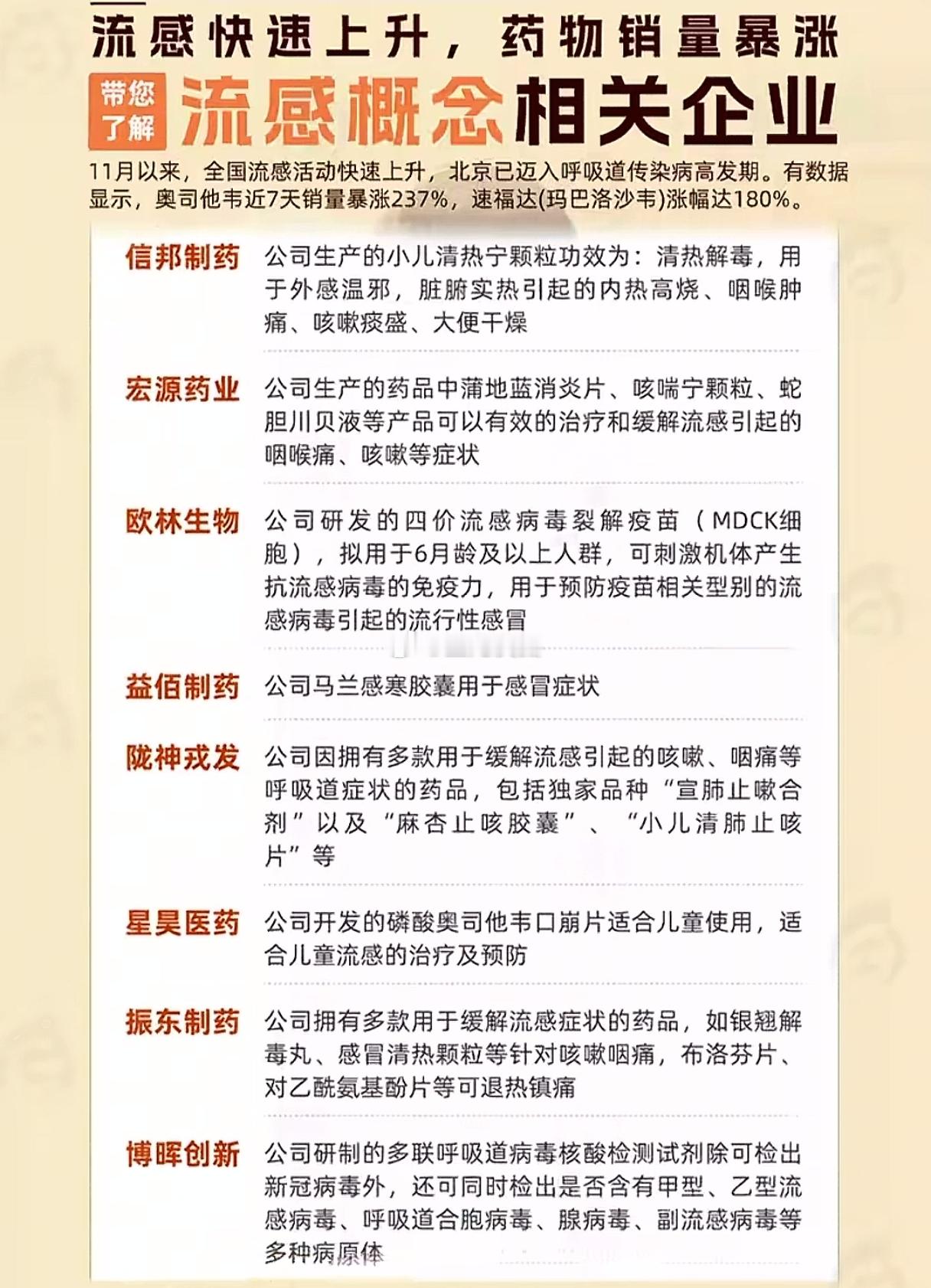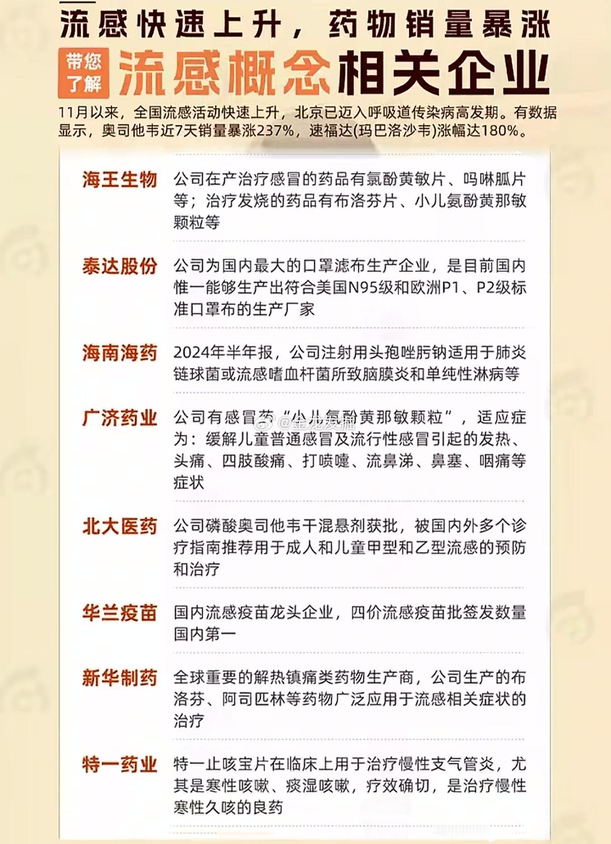 流感病例激增用药需求爆发,核心药企成市场关注焦点近期全国流感活动水平明显上升,多地进入呼吸道传染病高发季节。奥司他韦等抗流感药物需求大幅增长,部分药品销量一周内涨幅超200%,相关医药企业的产品供应与市场表现成为焦点。从产业链来看,各细分领域龙头企业凭借其产品布局与产能优势,在此轮流感高峰中展现出明确的市场价值:疫苗领域华兰疫苗作为国内流感疫苗领军企业,四价疫苗批签发量稳居全国首位,为流感预防提供核心支持。抗病毒药物北大医药、星昊医药等企业的奥司他韦制剂覆盖成人及儿童患者,成为流感治疗的一线用药选择。儿童专用药康芝药业专注儿童退热与感冒类药品研发生产,精准满足儿科用药特殊需求。防护用品泰达股份作为口罩滤材主要供应商,为个人防护提供基础保障。检测诊断博晖创新推出多联检测试剂,可同步检测甲流、乙流等呼吸道病原体,助力精准诊断与分型治疗。此轮流感高发期凸显了医药企业在公共卫生事件中的关键作用,这些企业的产品既是临床诊疗方案推荐用药,也是公众应对流感的首选,其市场表现实质上反映了医疗需求与产业供给的高效匹配。以上信息为公开资料整理,不构成任何投资建议。