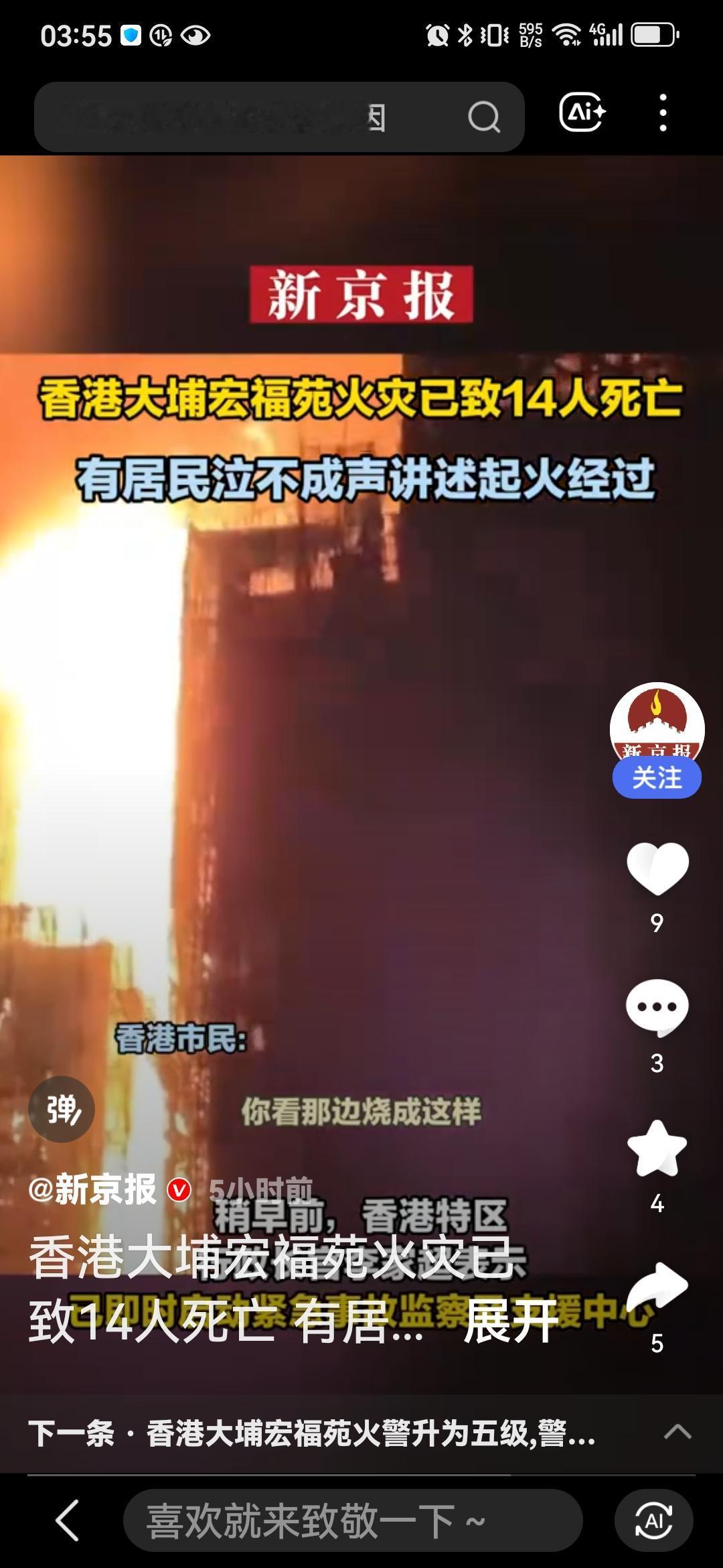 香港刚发生巨大火灾,火烧连营已造成重大人员伤亡! 11月26日下午,香港大埔宏福苑发生五级火警。到27日凌晨,造成至少36人遇难,279人失联。 宏福苑位于大埔市中心大埔公路元洲仔,1983年建成使用,楼龄已有42年,共有8座,提供1984个单位,住户4643人。 起火点位于宏昌阁外墙棚架,火势蔓延至小区内7栋楼宇。 原因初步调查与维修作业相关,具体包括维修物料、风力及棚架堆放杂物等因素。目击者称维修工人曾抽烟,且棚架上堆放杂物可能被高温火源引燃。 我们祈祷,赶紧调动一切手段灭国,紧急救治伤员,减少人员伤亡。并祈祷逝者安息!天堂里没有火灾。[蜡烛][蜡烛][蜡烛]