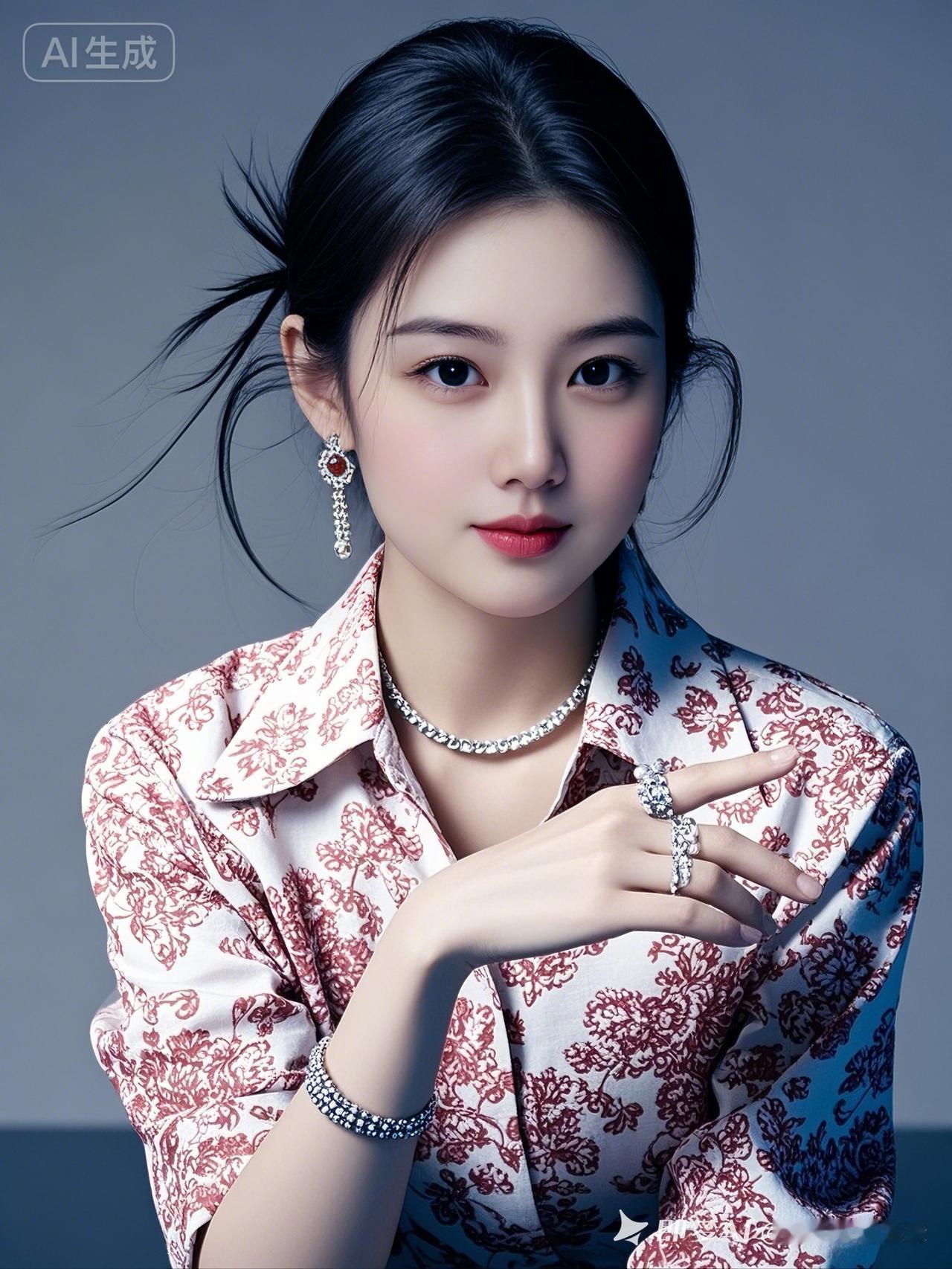 冷白皮美女身着时尚槐红色青花瓷花纹棉麻衬衫,头发随意挽起,精致妆容衬得五官愈发灵动。她佩戴耳环、项链、手链与戒指,温和微笑满是亲切感,简约中尽显优雅品位。