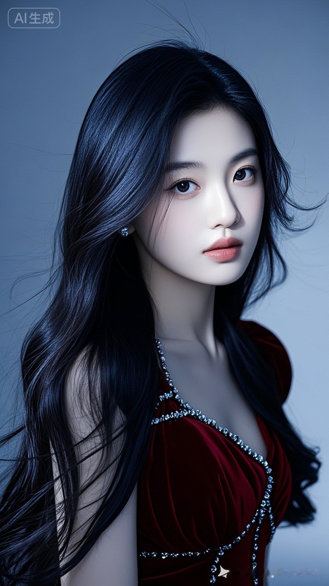 秀丽小姑娘长发飘飘,身着高贵典雅的红色衣衫,高挺鼻梁下藏着迷人小酒窝。她神情带着淡淡忧郁,将少女的柔美与怅然交织,精致而动人。