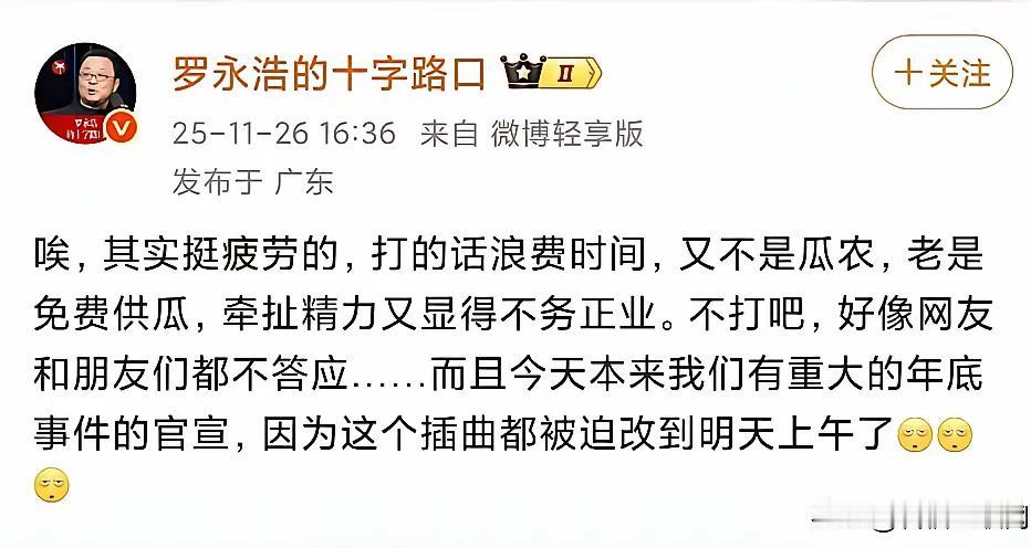 从昨儿下午开始,那么多人眼巴巴地瞅着时间到六点等着看瓜,结果,销声匿迹了,罗永浩人呢?说好的录音呢?咋没了,被大风刮跑了? 这都27号早上四点多了,刚又看到老罗发博说不想供瓜了,罗永浩你这也太让人失望了吧! 看来这次是罗永浩认怂了,华与华大胜。[捂脸]