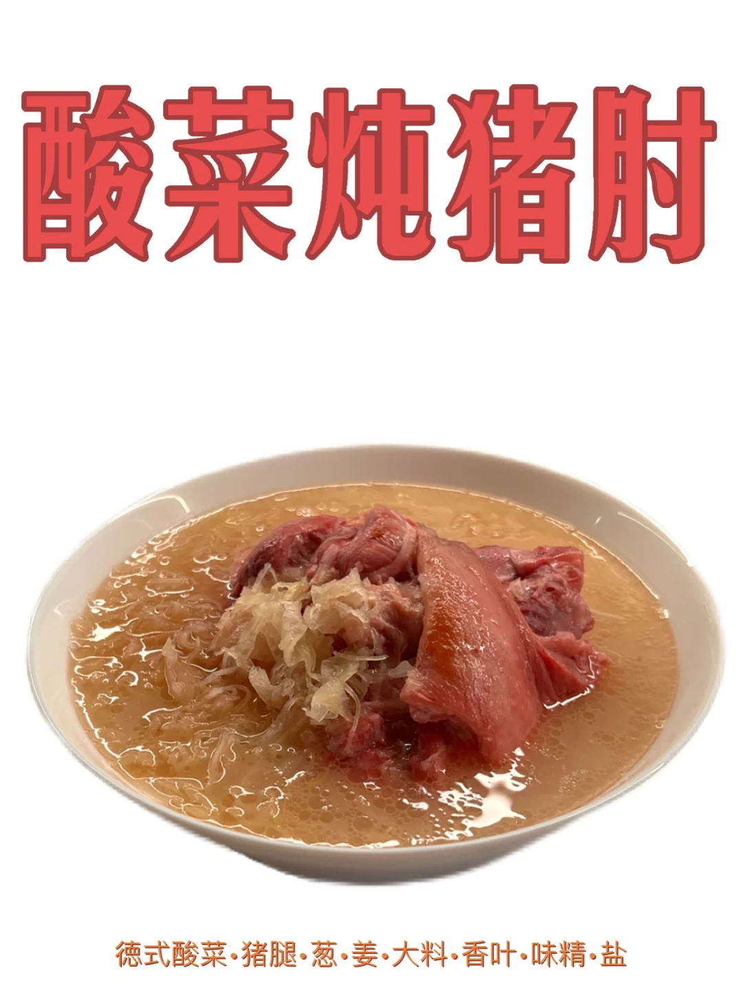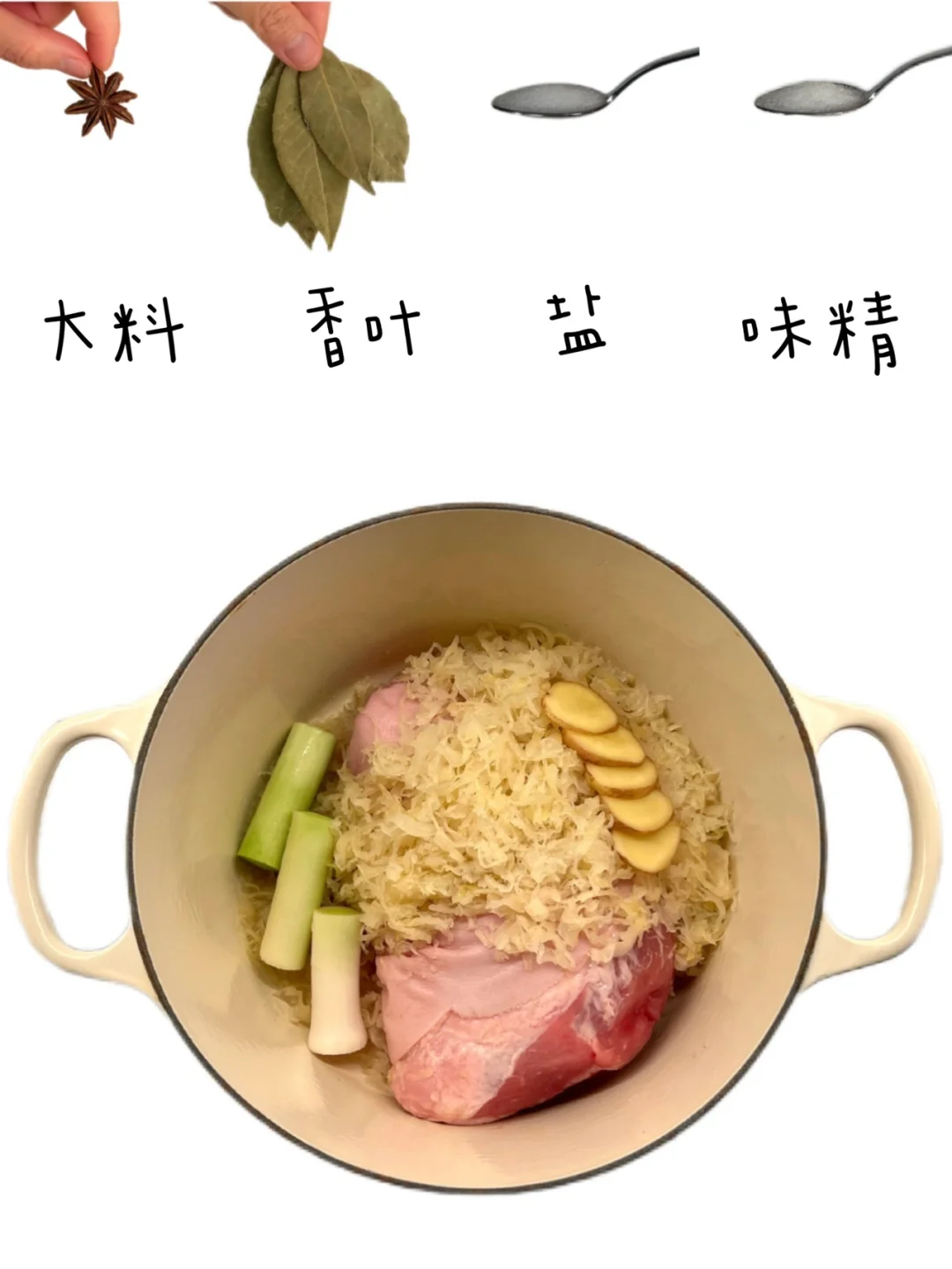 今早窗外瓢泼大雨 果断掏出铁锅炖锅猪肘子 图中所有材料一起扔锅里 加水煮1-2小时 水盖过所有食材 味精/鸡精都可 1-2汤匙 具体看水量 酸菜量和盐量根据口味添加 有粉条也可煮里 非常好吃 有香菜也撒一些 增色又增香