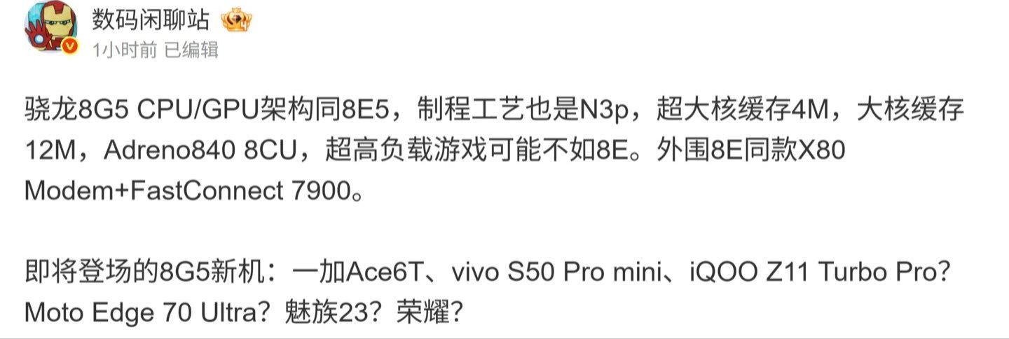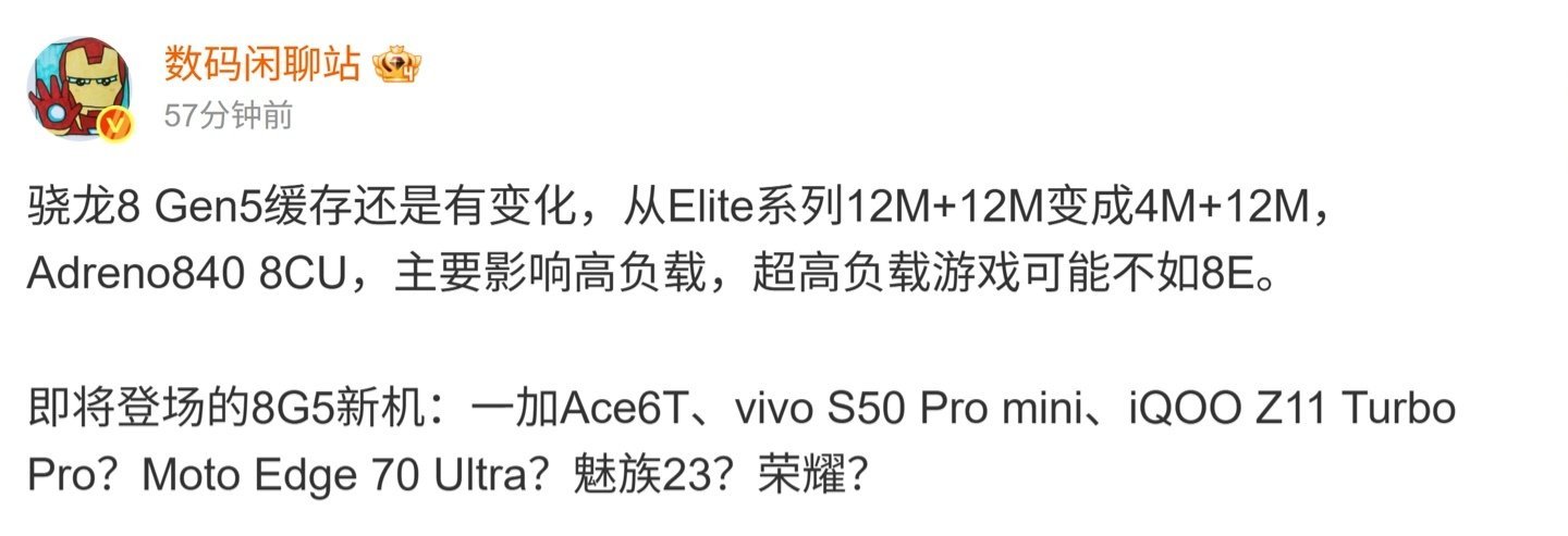 【曝骁龙 8 Gen 5 芯片缓存有变化,超高负载游戏表现可能不如 8 Elite】博主 数码闲聊站在微博透露,高通骁龙 8 Gen 5 芯片的 CPU / GPU 架构与 8 Elite Gen 5 相同。博主表示,骁龙 8 Gen 5 芯片采用了台积电 N3p 制程工艺,超大核缓存 4M,大核缓存是 12M,相比 8 Elite Gen 5 的 12+12M 有所变化,配备 8CU 的 Adreno 840 GPU,超高负载游戏表现可能不如 8 Elite,但配备了 8 Elite 同款的 X80 基带、FastConnect 7900 移动连接系统。同时博主还在文中透露了即将登场的 8 Gen 5 芯片新机:一加 Ace 6T、vivo S50 Pro mini、iQOO Z11 Turbo Pro?Moto Edge 70 Ultra?魅族 23?荣耀?博主还在评论区补充道,他已经测完了该芯片详细性能,实际游戏表现可能会“出乎意料”。后续有用户在评论区表示:“其实比 8sgen4 要好的多,至少能效核缓存没有砍”,博主回复道:“是的,还是和最开始说的一样,高负载游戏比 8e 差一点,但差距没有那么大”;另一名用户则询问道:“我米呢?”,博主则回复道:“天玑 n-1 喜欢吗”。高通骁龙 8 Gen 5 处理器现已正式发布,配备第三代 Oryon CPU,包括 2 个主频为 3.8 GHz 的 prime 核心和 6 个 3.32GHz 的性能核心,相比两年前的骁龙 8 Gen 3 在 CPU 任务上有 36% 提升,GPU 提升 11%,AI 任务提升 46%。