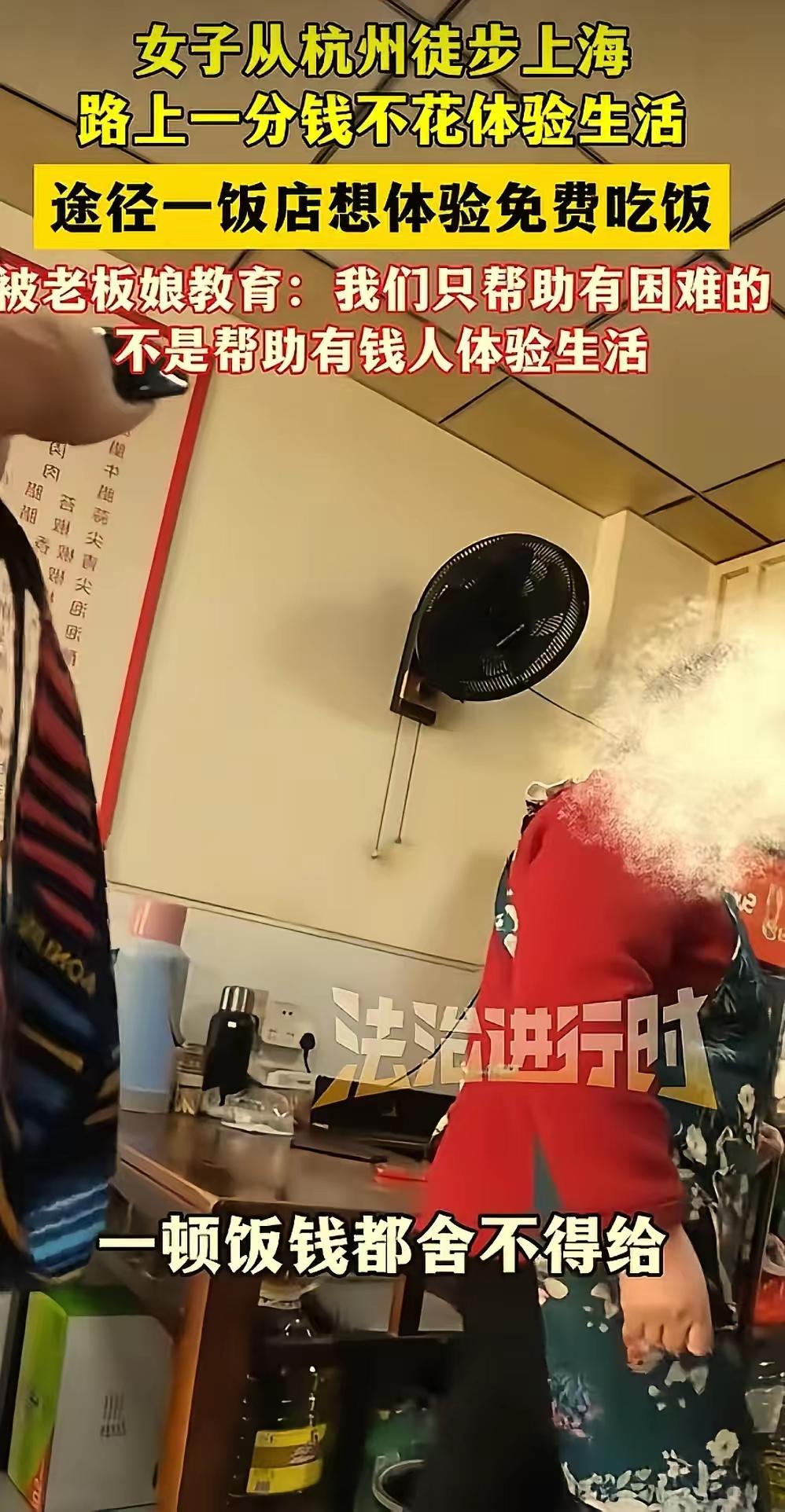女子为了体验生活,从杭州徒步到上海,挑战路上一分钱不花,让别人请自己吃饭。途径一饭店想体验免费吃饭,被老板娘当场教育:“我们只帮助有困难的人,不是帮助有钱人体验生活!”网友:骂的太好了!什么叫体验生活,一路上捡纸壳子饮料瓶,自己动手丰衣足食,而不是一路“白嫖”! 在这个物欲横流的时代,很多人把“体验生活”变成了“炫耀资本”,以为用钱就能买到快乐。可是,这位女子用自己的行动戳中了许多人的痛点:真正的生活,不是靠花钱堆砌出来的,而是在困境中坚持、在困难中成长。她用徒步,从杭州到上海,途经的每一个角落,都在诉说着一种坚韧不拔的精神。这不仅仅是一场长途徒步,更像是一场对生活的深刻反思。 沿途,她没有依赖豪华的住宿,没有享受高档的美食,而是选择用最原始的方式感受生活的真谛。捡拾瓶子、换取一顿简易的饭菜,这样的“体验”或许不够光鲜亮丽,但却最接近生活的本质。她用行动告诉我们:真正的生活,不在于你拥有多少,而在于你愿意为生活付出多少。那些在富丽堂皇的餐厅里吃饭的人,也许永远无法体会到那份简单的满足感。 更令人震惊的是,遇到一饭店老板娘的那一幕。老板娘并没有像很多“善意”的人那样,只是轻描淡写地送上几句安慰,她站出来,讲出了令人深思的话:“我们只帮助有困难的人,不是帮助有钱人体验生活!”这句话像一记耳光,击中了许多人的盲点:有人把“体验生活”变成了炫耀的资本,却忽视了那些真正需要帮助的人。 网友们的反应也异常激烈。有人骂得痛快:“就是说得太好了!体验生活不该是白嫖,应该是用心感受。”也有人开始反思:我们是不是把所谓的“生活体验”变了味?在这个追求效率和炫耀的时代,是否我们都迷失了初心? 其实,这个事件折射出一个更深层次的问题:我们到底在追求什么?是表面的奢华,还是内心的丰富?是短暂的炫耀,还是持续的成长?或许,真正的“体验生活”,不是用金钱堆砌的“奢华”,而是在平凡中坚持自我,在困境中看到希望。 这位女子用她的行动,向我们诠释了另一种生活的可能:那就是用心去感受,用行动去践行。她让我们明白,生活的美好,不在于你花了多少钱,而在于你有没有那份坚持和勇气。在这个物欲横流的世界,或许我们都需要一场“徒步”,去重新找回那份纯粹的感动与勇气。 所以,下次当你觉得生活难堪、压力山大时,不妨想想她的故事。也许,真正的“体验生活”,不是去炫耀自己拥有的,而是在困境中坚持,用心去感受每一份简单的幸福。因为,只有这样,我们才能真正懂得:生活,原来可以如此美好。人类欲望的本质 生活价值感 生活满足感 生活品质感
