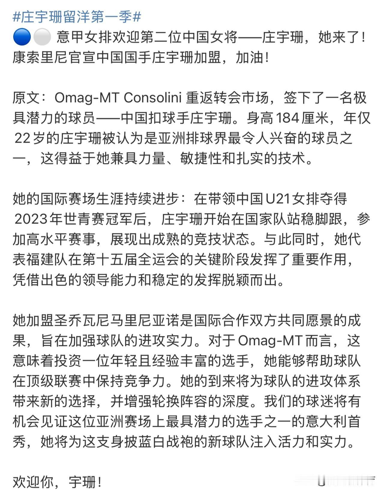 等了这么多天,终于等来了庄宇珊的好消息!早上打开手机,就看到了意大利女排联赛官宣了中国女排主攻手庄宇珊的加盟!虽然她加盟的圣乔瓦尼马里尼亚俱乐部联赛排名靠后,但是能走出去就是一大进步!这支俱乐部没有特别大的强攻点,宇珊去了之后应该可以打上首发!22岁就迎来了职业生涯的第一次海外留洋之旅,跟朱婷一样!意甲俱乐部给了宇珊高度评价,亚洲排球界最具潜力队员之一!