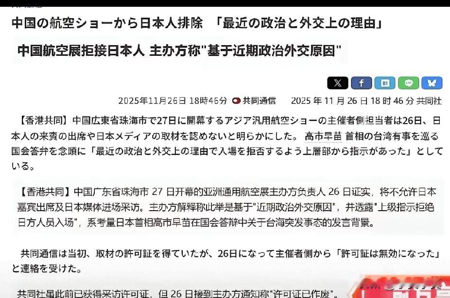 珠海打响抵日第一枪:珠海航展拒绝日本嘉宾及媒体进入 珠海亚洲通用航空展开幕前夕,主办方明确拒绝日本嘉宾出席及媒体采访的消息,如一石激起千层浪,在网络空间引发热议。有人为这份“硬核态度”拍手称快,赞其彰显民族骨气;也有声音担忧此举会影响中日民间交流,引发不必要的争议。但褪去情绪的浮沫便会发现,这绝非一时兴起的“排外”,而是基于国家安全与核心利益的理性抉择,是大国崛起进程中应有的底气与坚守。 航空展从来不止是技术成果的展示台,更是国家核心工业实力的缩影。如今的中国航空工业,早已摆脱了追随者的身份,在通用航空、军机研发等多个领域实现从并跑到领跑的跨越。这些凝结着无数科研人员心血的技术成果,承载着国家发展的战略密码,绝非可以随意窥探的“公开展品”。日本在航空制造、军事技术领域与我国存在诸多竞争与博弈,过往不乏技术窃取、信息刺探的前车之鉴。主办方拒绝日方参与,本质上是对核心技术的精准保护,是对国家利益的坚定捍卫——在安全底线面前,没有模糊地带,更无妥协空间。 这份拒绝,更是一种清晰的态度传递:中国的发展成果,理应由中国掌握主导权。曾经,我们在技术封锁中艰难求索,不得不看人脸色;如今,我们有能力搭建世界级的展示平台,更有底气制定参与规则。“我的地盘我做主”从来不是霸道,而是一个主权国家的正当权利;守护自己的发展成果,也绝非狭隘的封闭,而是对公平竞争、良性互动的基本诉求。那些将正常安全防范曲解为“排外”的声音,恰恰忽视了国际交往中“安全优先”的基本准则,更低估了中国守护核心利益的决心。 中日民间交流的基础是相互尊重与平等相待,而非单方面的妥协迁就。真正的交流,不应以牺牲国家安全为代价,更不能让别有用心者借“交流”之名行“窥探”之实。中国始终秉持开放包容的态度,欢迎各国秉持善意、遵守规则的朋友参与合作,但对于可能存在的风险与威胁,我们必须保持清醒的认知与坚定的防范。 珠海航展的“拒日令”,说到底是大国自信的生动体现。当我们不再需要通过讨好他人来证明自己,不再需要用妥协换取认可,便意味着真正的强大已然到来。这份底气,源于数十年如一日的技术积淀,源于日益提升的综合国力,更源于对国家利益与民族尊严的坚定守护。在复杂多变的国际环境中,唯有守住安全底线,才能更好地拥抱开放合作,这正是珠海航展给我们的深刻启示。