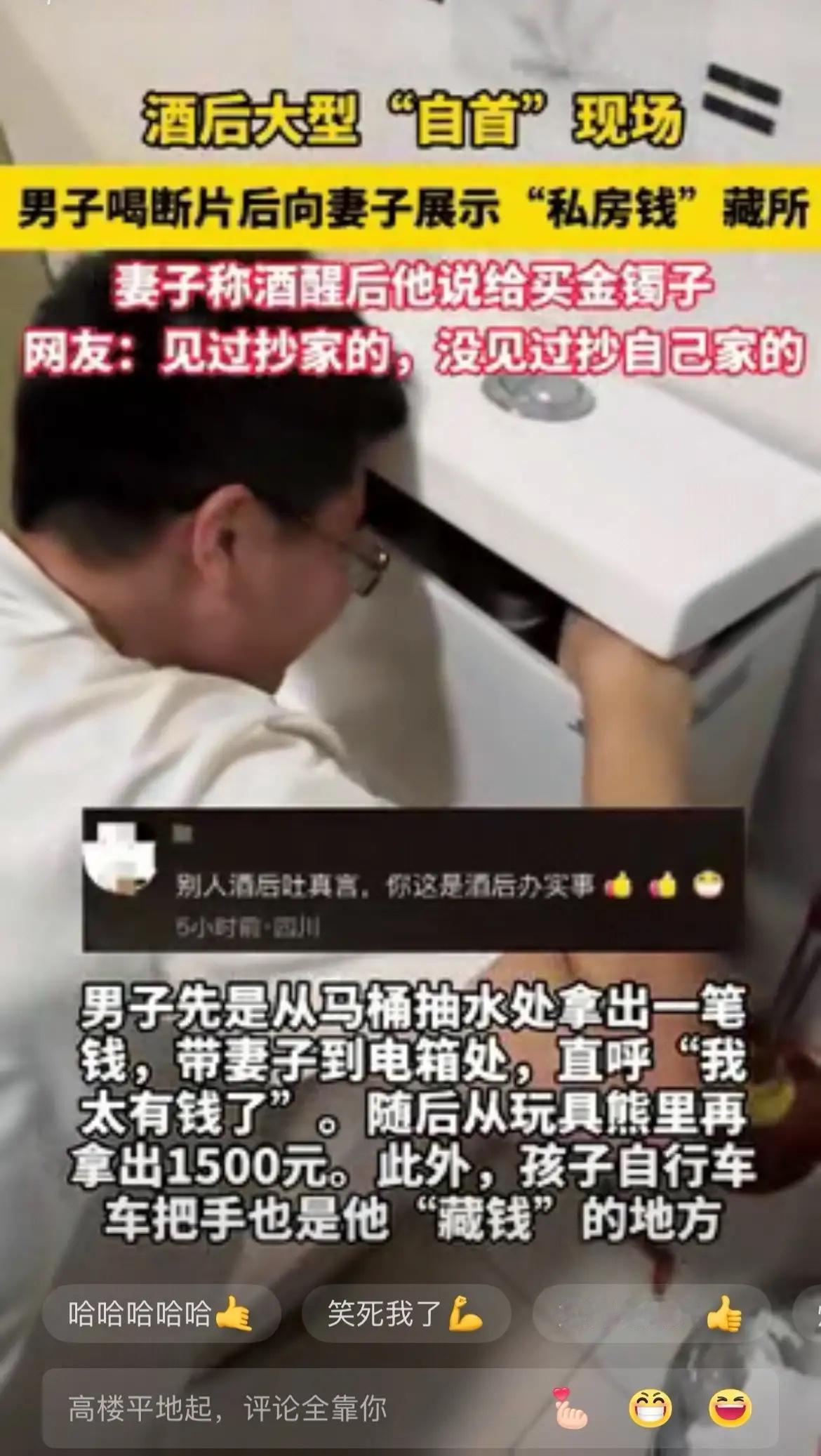 哈哈!笑不活了!河北廊坊,男子喝多回家,嘴里一直念叨“我可有钱了”,妻子顺坡下驴,问他怎么个有钱法,没想到男子从各个角落里把自己藏起来的私房钱全翻了出来。网友:“这该死的分享欲,酒醒后发现自己返贫了!” 说真的,刷到这个视频的时候,我直接笑出了声。视频里那大哥醉醺醺的样子,眼神迷离还带着点小得意,上手就扒拉鞋柜最底层的鞋盒,从里面掏出一叠用橡皮筋捆着的现金,动作熟练得让人心疼。妻子在旁边举着手机拍,一边拍一边笑,嘴里还打趣他:“哟,原来你藏得这么深啊?”大哥还挺较真,梗着脖子反驳:“那可不,我攒了大半年呢,以后给你买金镯子!” 结果说着说着,又想起什么似的,转身冲到阳台,搬开花盆,从底下摸出一个塑料信封,里面全是五十、二十的零钱,凑在一起居然也有厚厚的一沓。 谁能想到,平时看着老实巴交的男人,藏私房钱的本事这么大。后来看评论区才知道,这大哥平时工资都上交,就留着点零花钱,舍不得吃舍不得穿,一点点攒起来,本来想在结婚纪念日给妻子一个惊喜,没成想喝多了酒,把自己的“小金库”全给抖搂出来了。妻子说,当时看着他一边翻钱一边炫耀的样子,又好气又好笑,气的是他居然瞒着自己藏钱,笑的是他喝多了之后那股子实诚劲儿,连藏钱的地方都没来得及隐瞒。 其实仔细想想,这种事儿在生活里太常见了。我身边就有朋友,她老公也是这样,总喜欢在车里的储物格里、书架的书缝里藏点现金,每次被发现,都一脸委屈地说:“我就是想留着点钱,万一你想买点什么不好意思跟我说,我能偷偷给你付款。” 一开始朋友还会生气,觉得他不信任自己,后来才发现,男人藏私房钱,有时候真不是为了自己挥霍,更多的是一种“安全感”,或者说是想给对方一个意外的惊喜。他们觉得,直接把钱上交,不如自己攒着,在特殊的日子里,拿出一笔钱,买对方心仪已久的东西,那种成就感,是直接给钱比不了的。 不过话说回来,藏私房钱这事儿,还是得有分寸。有的男人藏钱是为了家庭,有的却是为了自己潇洒,这两者有着本质的区别。廊坊这位大哥,藏钱是为了给妻子买礼物,这样的“私房钱”,就算被发现了,也只会让夫妻感情升温。但如果是为了偷偷出去喝酒、打牌,甚至做一些对不起家庭的事情,那可就另当别论了。所以说,夫妻之间,最重要的还是沟通和信任。与其偷偷摸摸地藏钱,不如坦诚相待,告诉对方自己的想法,就算是想攒点钱给对方惊喜,也可以提前透露一点,这样既不会产生误会,也能让惊喜更有意义。 网友们的评论也是五花八门,有人说:“这大哥酒醒了之后,估计得哭晕在厕所,辛辛苦苦攒了大半年的钱,一夜回到解放前。” 还有人说:“嫂子赶紧把钱存起来,就说他喝多了胡言乱语,没这回事儿。” 更有人分享了自己的经历:“我老公上次喝多了,把藏在床底下的私房钱全拿出来,还分给我一半,说以后咱们一人一半,酒醒了之后,他自己都忘了这事儿,我跟他说的时候,他脸都红了。” 这些评论,看着好笑,其实都藏着生活的烟火气,也反映出了夫妻之间最真实的相处模式。 婚姻就像一场修行,两个人在一起,难免会有一些小秘密、小插曲。藏私房钱这件事,本身没有对错,关键在于出发点是什么。如果是为了家庭,为了对方,那这样的小秘密,反而会成为夫妻感情的调味剂。但如果是为了自己,为了一些不可告人的目的,那只会伤害到彼此的感情。所以说,夫妻之间,要多一份理解,多一份包容,多一份沟通,只有这样,才能让婚姻走得更远、更稳。 各位读者你们怎么看?欢迎在评论区讨论。