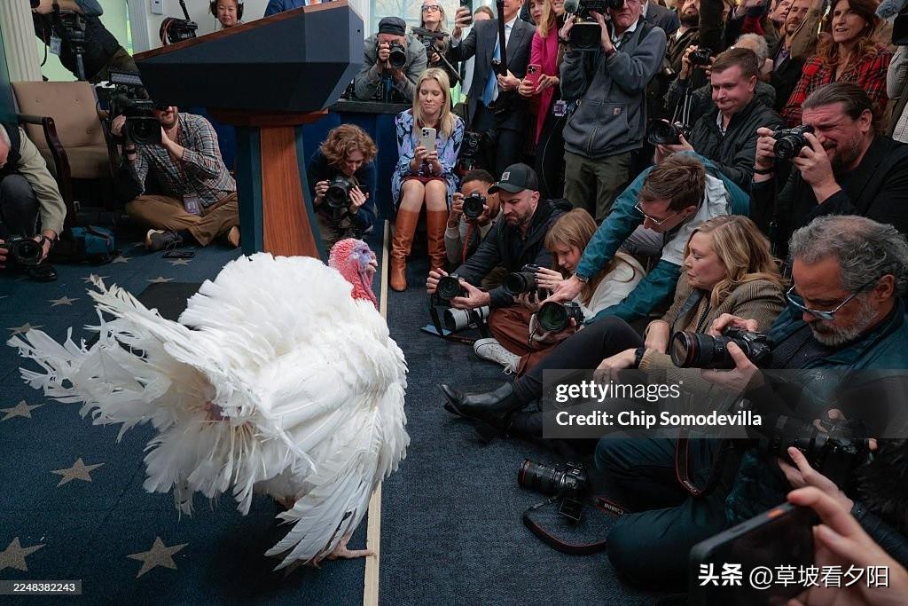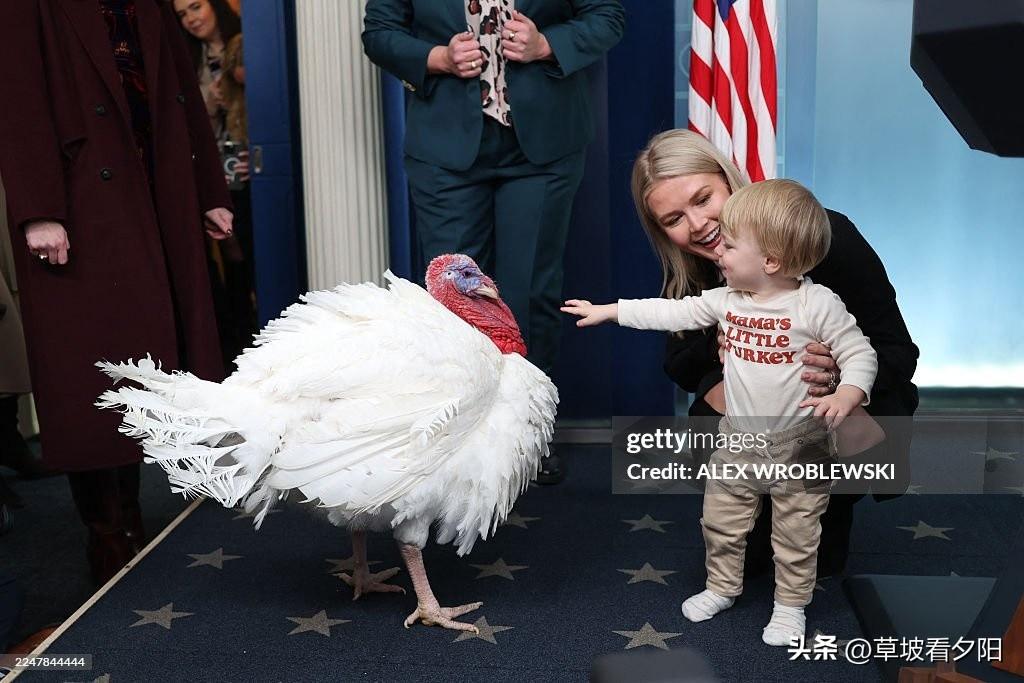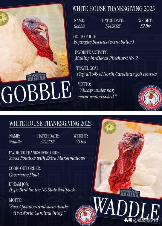 白宫感恩节太会整活!两只叫Waddle和Gobble的火鸡直接逆袭成“顶流”——不仅被专程接到华盛顿,活动前还住进了威拉德洲际酒店,吃住行待遇比不少人出差都强,妥妥的“鸡生赢家”~ 它们来这儿就为了参加白宫传统火鸡赦免仪式,简单说就是领“免煮金牌”,不用被端上感恩节餐桌。今年还有个大亮点:这俩是有史以来最重的赦免火鸡,每只都快55磅(差不多50斤),圆滚滚的像俩毛球小山,看着就憨态可掬~ 总统在仪式上还玩起了小幽默,对着Gobble笑着宣布:“我得告诉你个大事——你肯定被赦免了!” 转头又逗趣说:“就是Waddle不知道跑哪儿去了,找不着它的鸡影啦”,现场氛围超轻松~ 其实送火鸡的传统能追溯到20世纪中叶,但从1989年开始,“赦免火鸡”才成了每年固定的保留节目,原本可能端上餐桌的火鸡,现在成了感恩节最萌的仪式感,既有趣又有寓意~