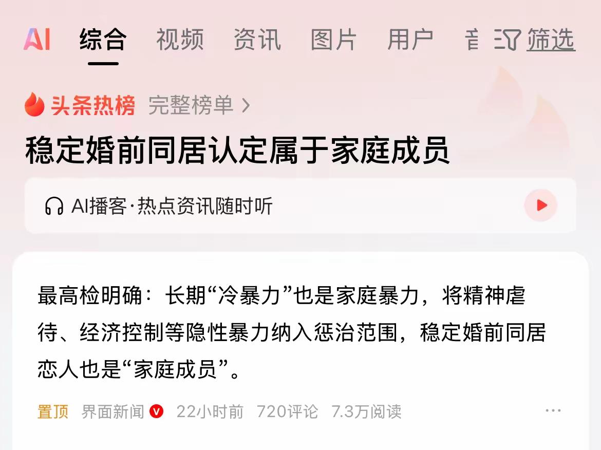 这下没结婚的人又有想法了。 新规出来了:只要同居就认定为家庭成员。 什么个意思呢?就是没结婚的情侣一起住也要负法律责任了,同居的时候遭到对方暴力,就要按照《反家暴法》来判了,精神虐待和冷暴力也算。 网友评论事实婚姻都取消了,同居怎么又算家庭成员了,越活越回去了。 也有网友说非婚同居,应该认定事实婚姻,应该与婚姻登记一样法律关系。 我觉得有必要,不然不结婚又到处乱来,导致婚后家庭的不稳定!