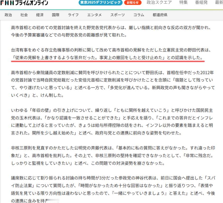 高市早苗已撤销原观点?11月26日,日本前首相野田佳彦表示:“高市早苗已覆盖原有