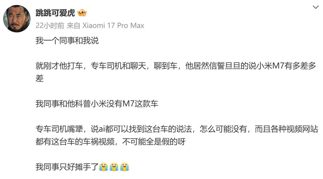 强烈建议小米好好查查这些造谣的人。这两天,大家都在讨论“小米M7”的事情,小米的高管们也是频繁转发信息进行“辟谣”。 “小米M7”是怎么来的呢?看看这种账号发的东西就知道了。我看到还有不少人编段子,要么说跟专车司机聊天,要么跟自己的什么亲戚朋友聊天,别人误认为M7就是小米的车,说的是有鼻子有眼的。 如果真的这样,对小米汽车品牌造成了如此大的负面,那我强烈建议小米官方不要只是辟谣,应该取证来起诉这些人。 不过,不知道这些人到底会是什么品种呢?