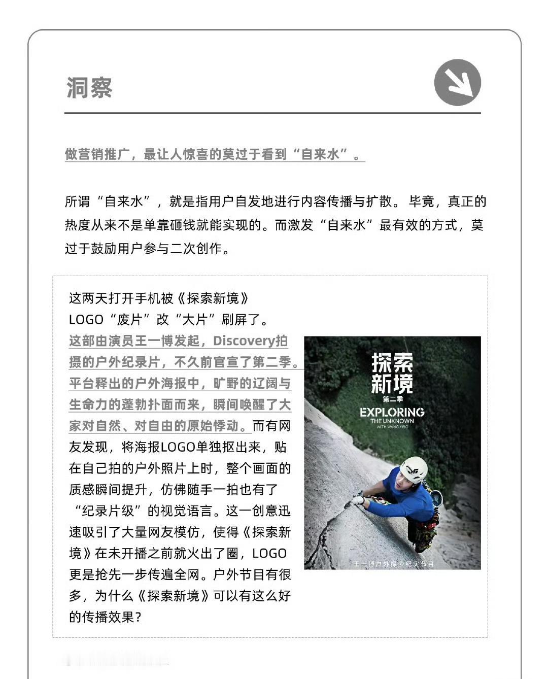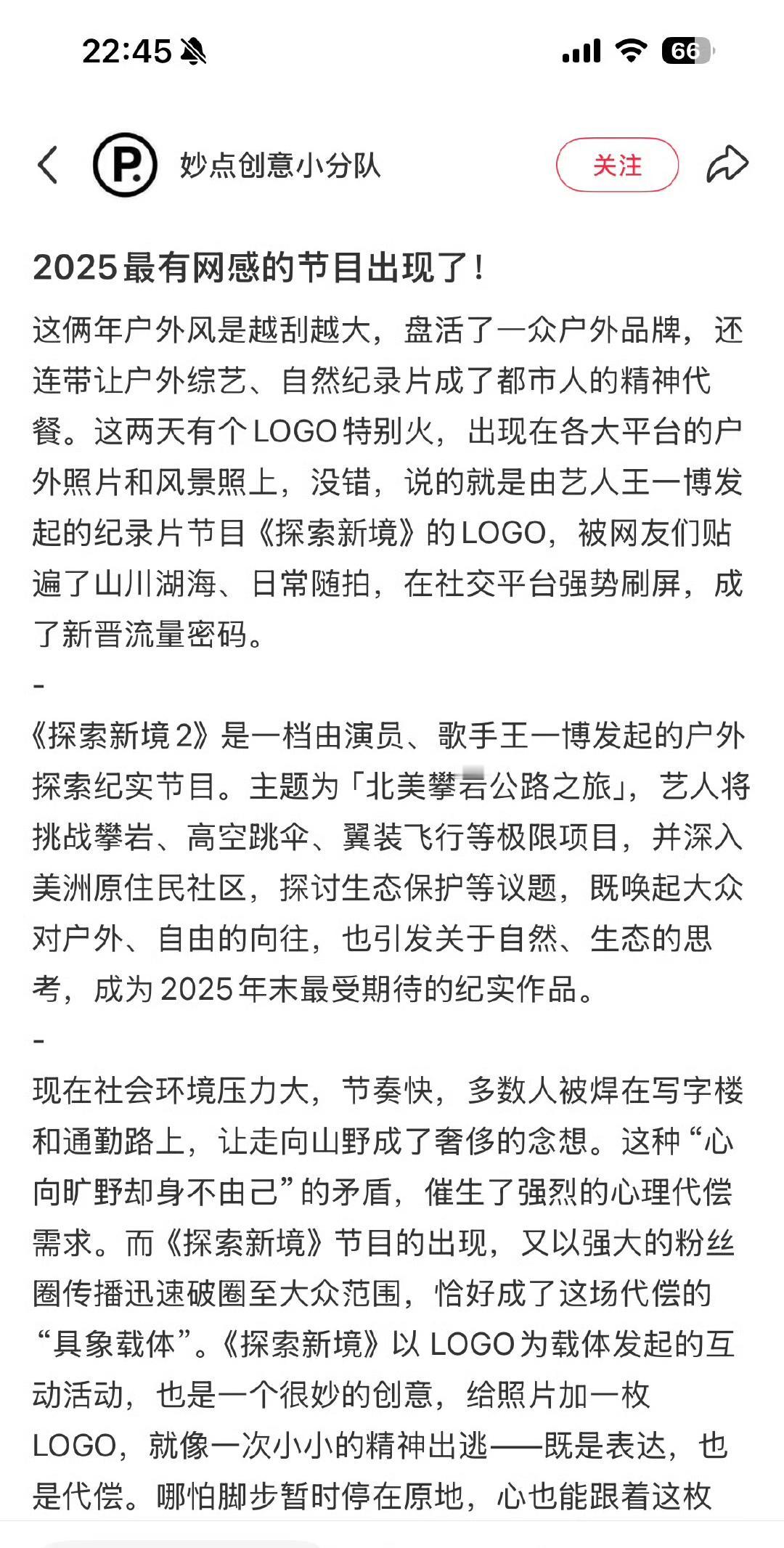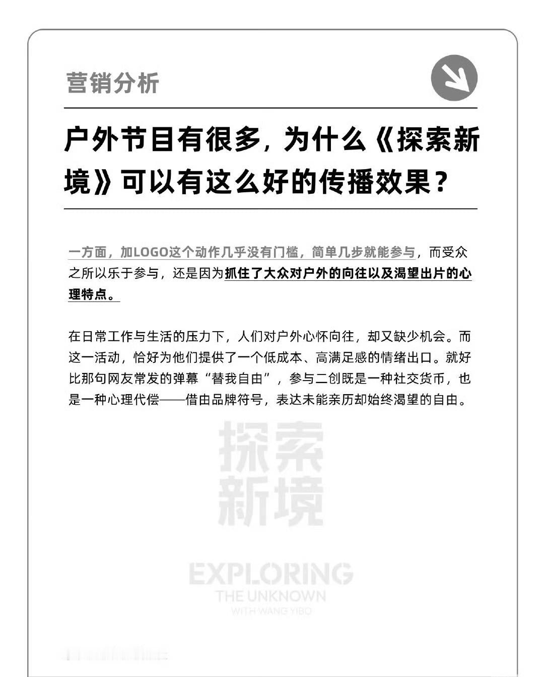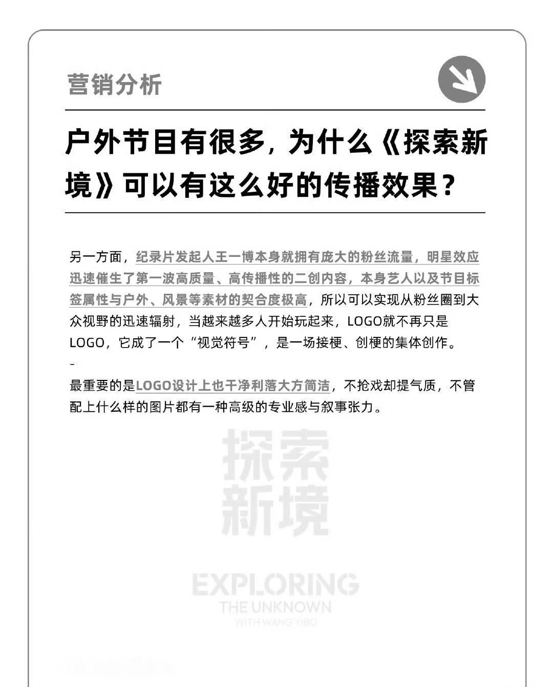 “户外节目有很多,为什么《探索新境》可以有这么好的传播效果?” 王一博的粉丝摩托姐姐们绝对是内娱最独特的存在,从火爆全网的“无名体”“博博宇宙表情包”到这两天瞬间火出圈的探索新境logo风景打卡照片,ibo就是名副其实的“千万级营宣发团队”,还是纯粹的“自来水”式[捂脸]。 《探索新境2》纪录片正式还未播出,logo已经彻底火爆出圈,才24小时不到已经被“分析”上了……[捂脸] 忽然想到之前光线会议专题“研究”过王一博粉丝,这不,《探索新境》再次成为“成功案例”,又有人开始“研究王一博粉丝”了[捂脸]。 王一博和王一博的摩托姐姐们,都很牛[赞]。 王一博 王一博探索新境2