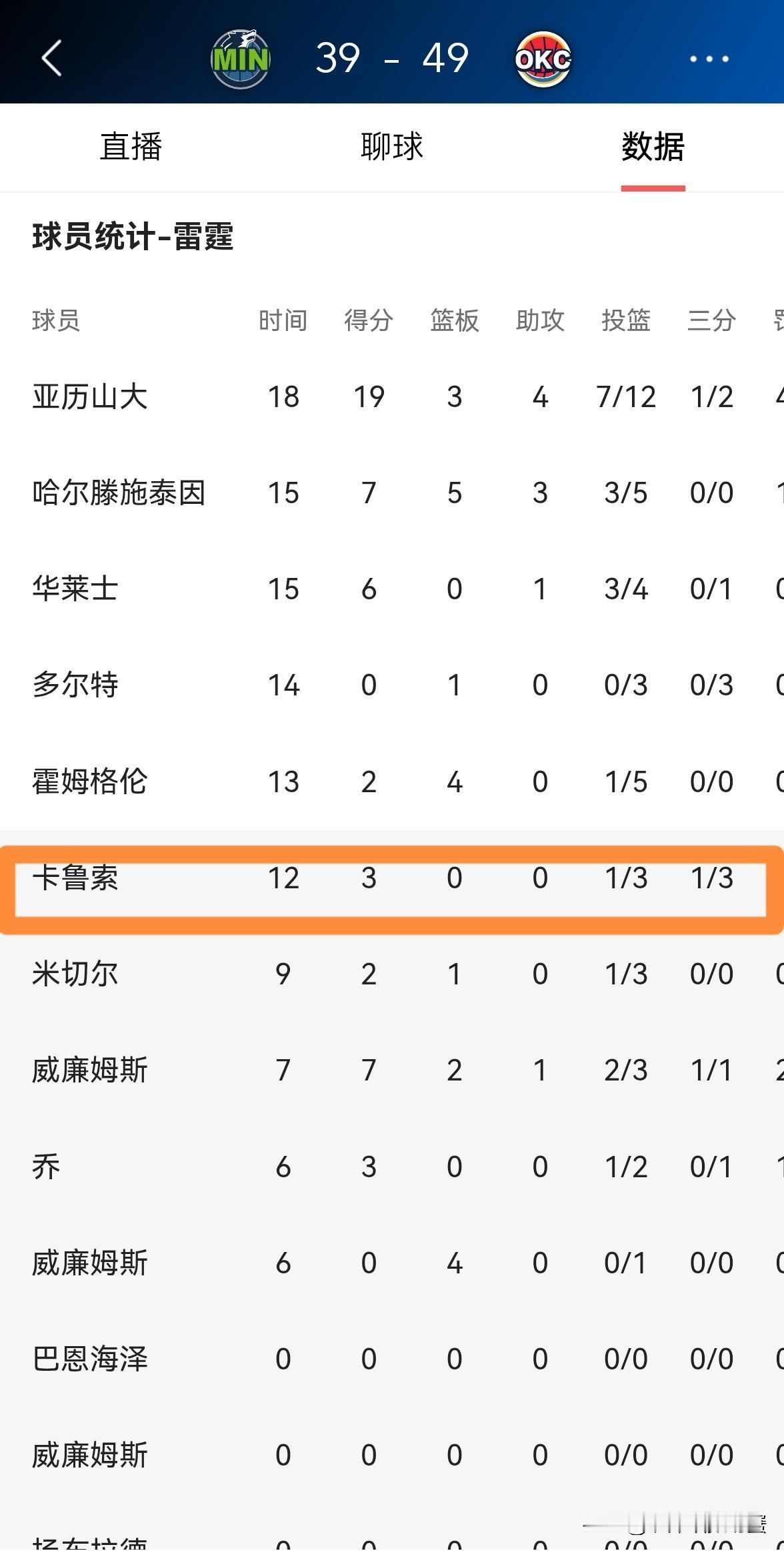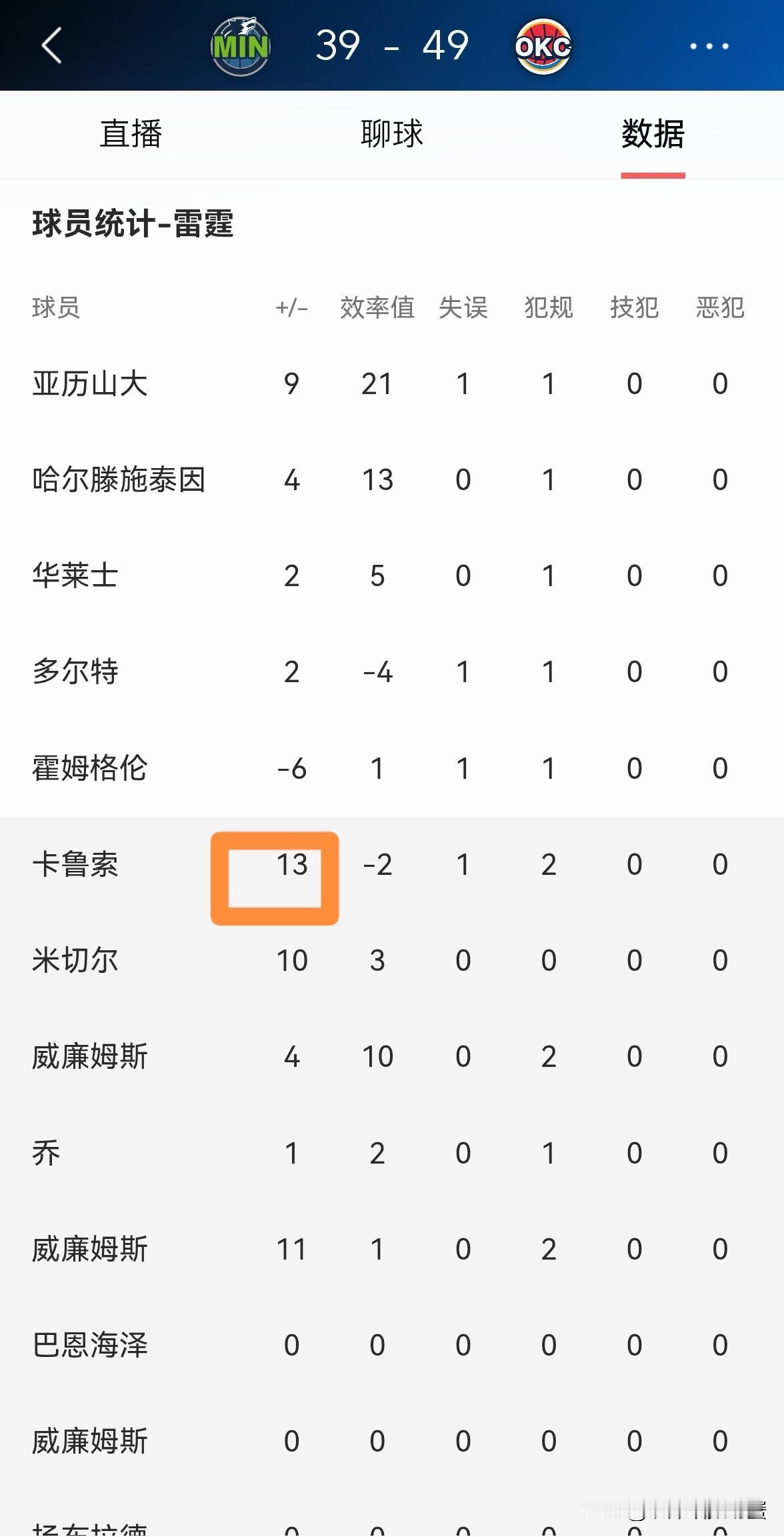 雷霆大将卡鲁索真是太让人“讨厌”了!在今天进行的雷霆和森林狼的比赛中,目前双方的上半场比赛已经结束,雷霆以49:39领先对手。值得一提的是,虽然在上半场比赛中,卡鲁索替补出战12分钟,三分球3中1仅仅得到3分,但是他的场上正负值却是全队最高的+13。 卡鲁索最让人“讨厌”的地方在于他从来不靠得分帮助球队,但是他的场上正负值经常是全队最高的。