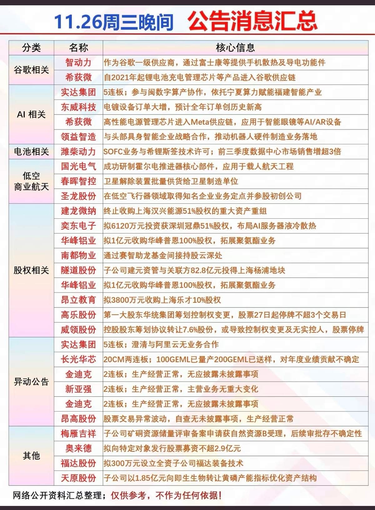 11.27周四 最新:上市公司公告汇总!29家公司发布公告!涉及股权转让,谷歌关联,ai相关,电池相关等。