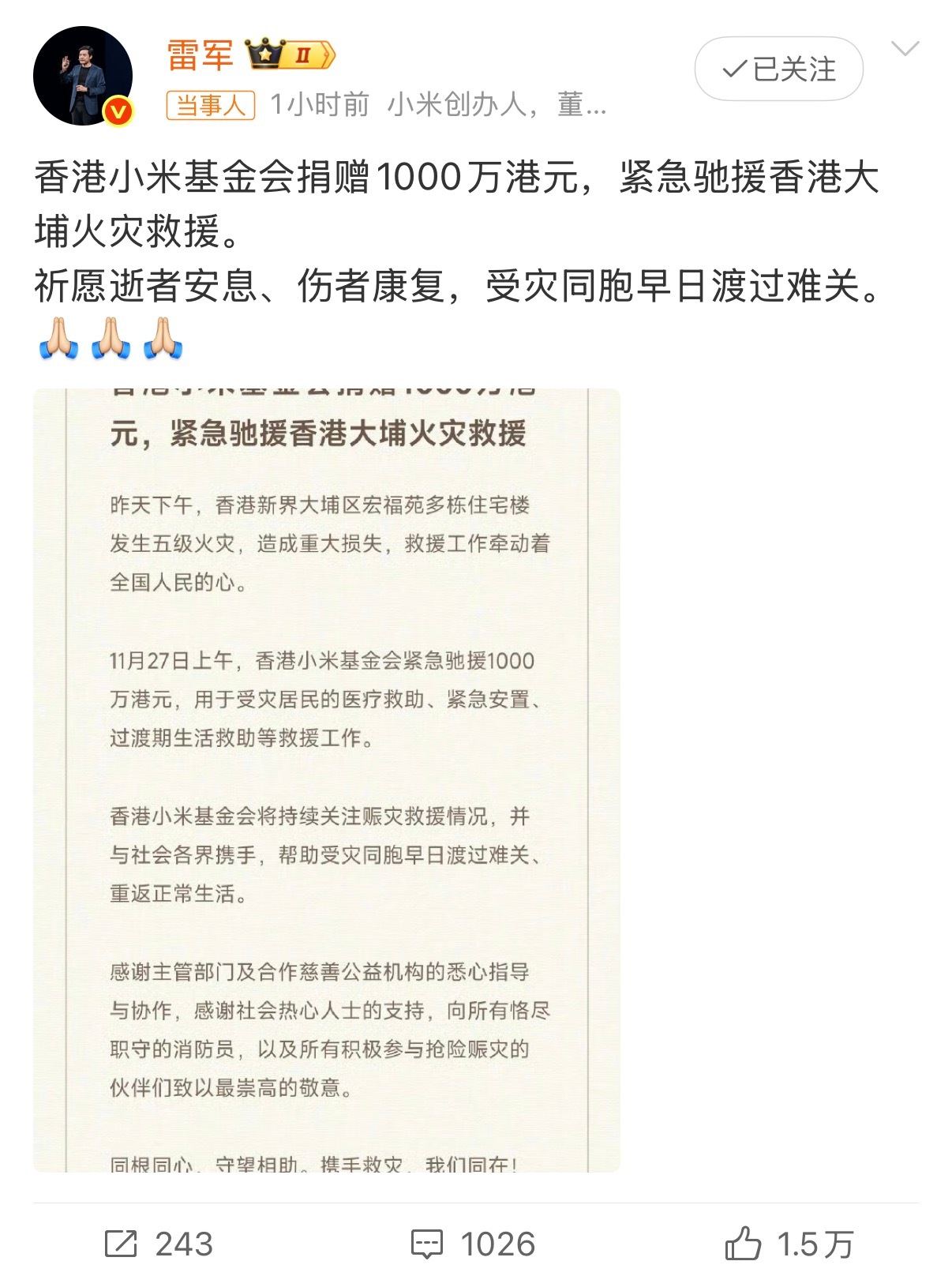 香港小米基金会捐赠1000万港元小米在大灾大难时候总能第一时间站出来,社会责任感很强……