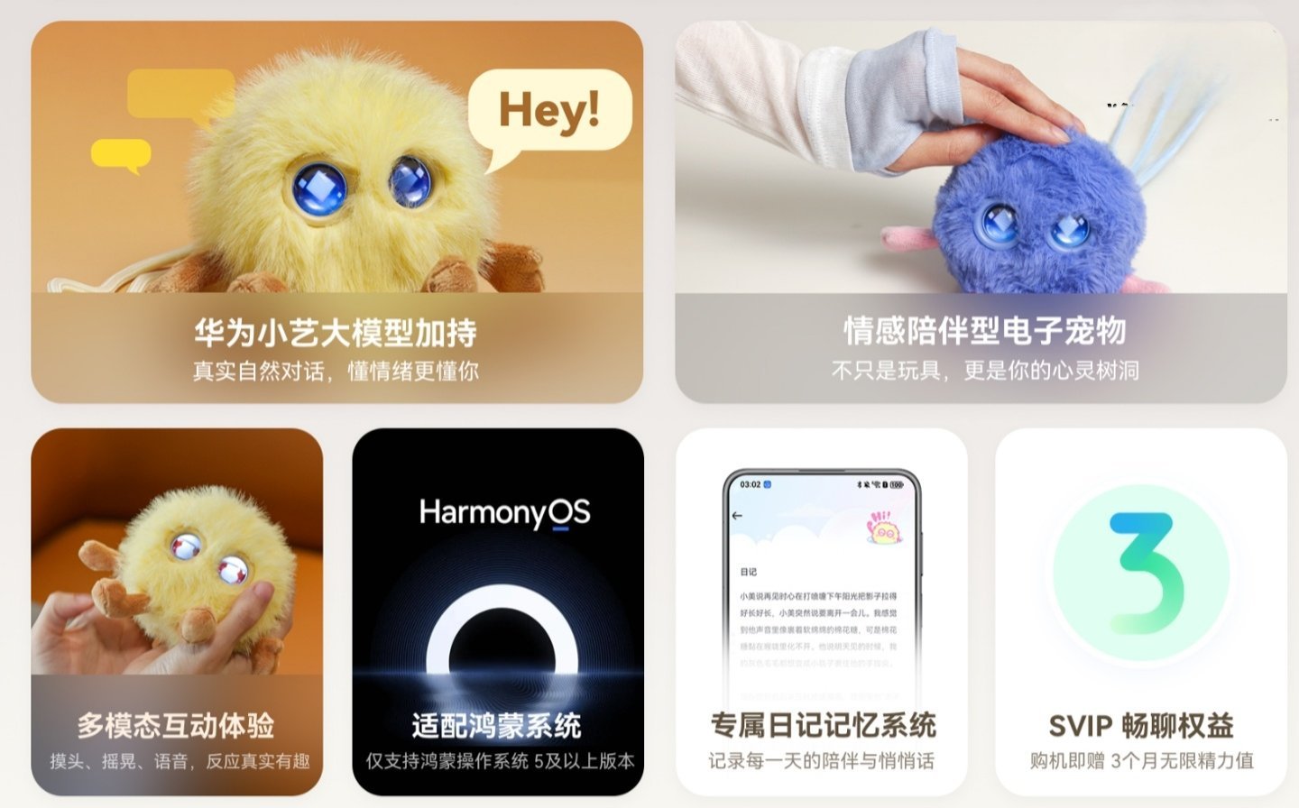 【“智能憨憨”电子宠物上架华为商城:内置小艺大模型、支持触摸交互,售价 399 元】华为发布了一款名为“智能憨憨”智能情感陪伴型电子宠物,售价: 399 元,将于 11 月 28 日 10 时 08 分开售。当时官方并未对新品进行详细介绍,不过目前该产品已在华为商城上架。据官方介绍,“憨憨”不仅是一款玩具,更是用户的心灵树洞,旨在通过科技与情感的完美结合,为用户提供温暖和陪伴。“憨憨”搭载了华为小艺大模型,具备真实自然对话的能力,能够更懂用户的情感需求。它不仅支持多模态互动体验,包括摸头、摇晃、语音等,还能适配鸿蒙操作系统 5 及以上版本,为用户提供更加丰富的互动体验。此外,“憨憨”还具备专属日记记忆系统,能够记录用户与它的每一次互动和悄悄话,成为用户情感的忠实记录者。“憨憨”的触摸交互功能是其一大亮点。它拥有柔软的毛绒材质,提供舒适的触感。用户可以通过触摸它的额头来观察它不同的表情反应,轻轻晃动它,它甚至会兴奋到发抖,增加了互动的趣味性。“憨憨”不仅是一个情感陪伴者,也是一个时尚搭子。它轻便的重量使其可以轻松搭配出街。此外,用户还可以通过购买不同的配饰来为“憨憨”变装,使其成为百变憨憨。