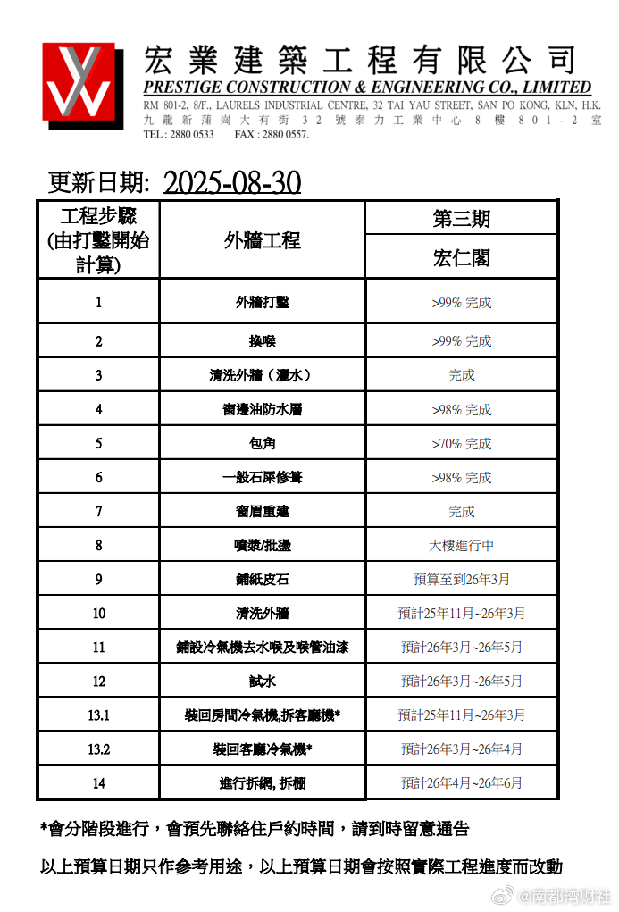 【发生重大火灾的#香港宏福苑原计划明年上半年拆网拆棚#】#香港宏福苑本次大维修集资超3亿港元# 11月26日,香港新界大埔屋邨宏福苑多栋住宅楼发生重大火灾事故。南都N视频记者梳理资料发现,起火点的宏福苑群楼于2024年7月以来启动大维修,集资金额超3亿港元。#大厦维修公司3人被香港警方拘捕#(图1为宏业建筑工程有限公司在工程解说会简报中出示的外墙保护工程示意图。图2为第三期工程进度表。)11月27日凌晨,香港警方和消防部门召开记者会宣布,火灾已造成44人遇难,45人受伤。香港保安局局长邓炳强表示,根据本次火灾现场初步调查情况分析,不排除刑事案件的可能性。香港警务处及消防处现已成立专责小组调查,将会采集外墙棚架物料进行检验,以确定是否符合防火标准。据披露,香港警方展开调查,发现建筑物外墙有保护网、防水帆布、塑料布,疑未符合防火标准,另有一座未波及的大厦每层电梯大堂窗外都有发泡胶包封,易燃且可能加速火势蔓延,不排除发泡胶是迅速蔓延的原因。警方发现一工程公司负责安装上述相关材料,相信该工程公司负责人严重疏忽,导致火势迅速蔓延,造成重大伤亡。警方拘捕的3人为工程公司负责人,包括2名董事、1名工程顾问,年龄介于52岁至68岁。南都记者梳理资料发现,起火点的宏福苑群楼落座于1983年,已有40余年楼龄,单户最大面积为44.9平方米。2024年7月以来,宏福苑由宏福苑业主立案法团启动了一次大维修,本次维修由业主立案法团集资超3亿港币,至今已动工1年零4个月。根据维修时间表,原计划于2026年3月至6月陆续拆网拆棚。(见习记者 李思涵 南都N视频记者 韦娟明)