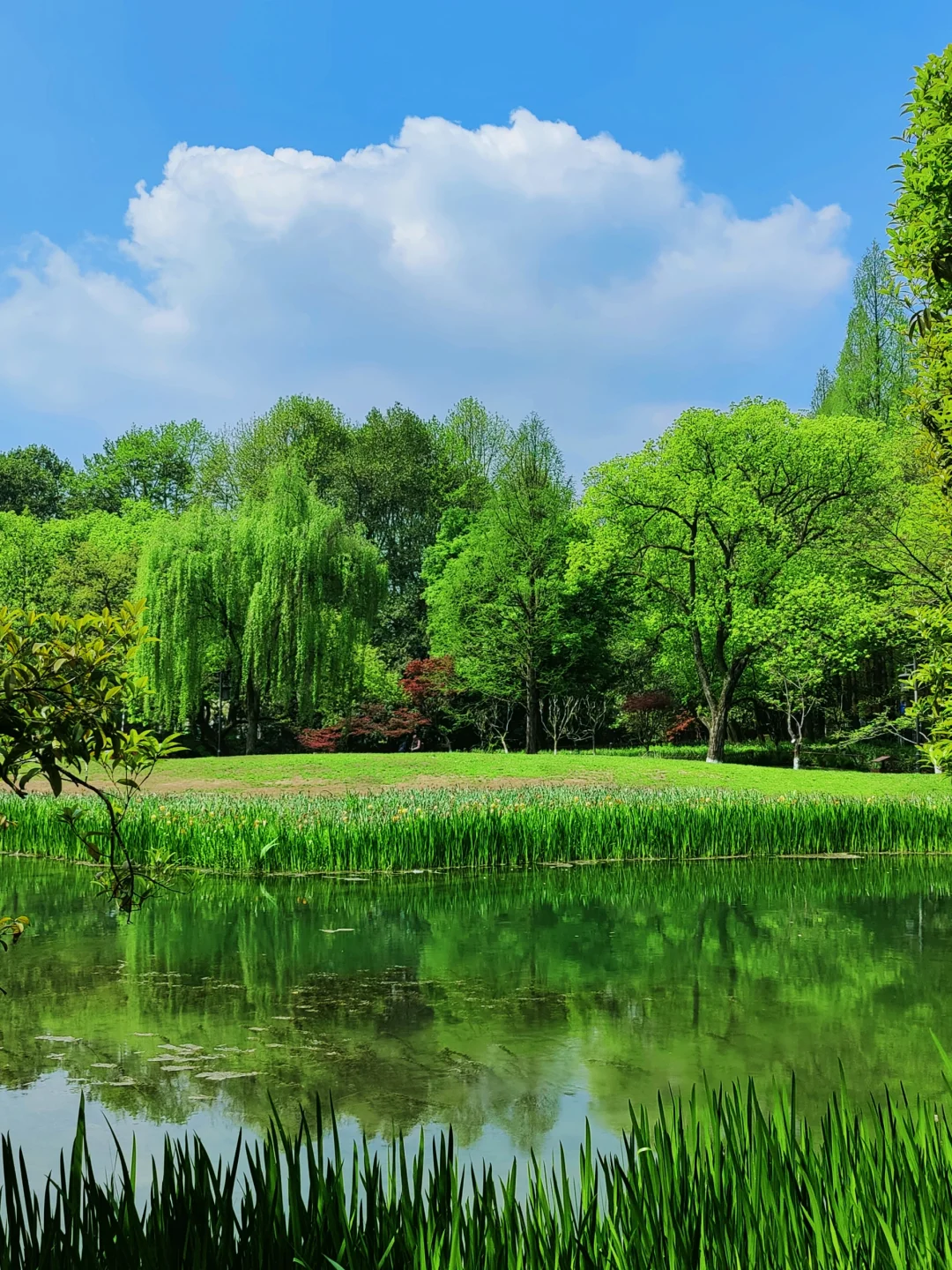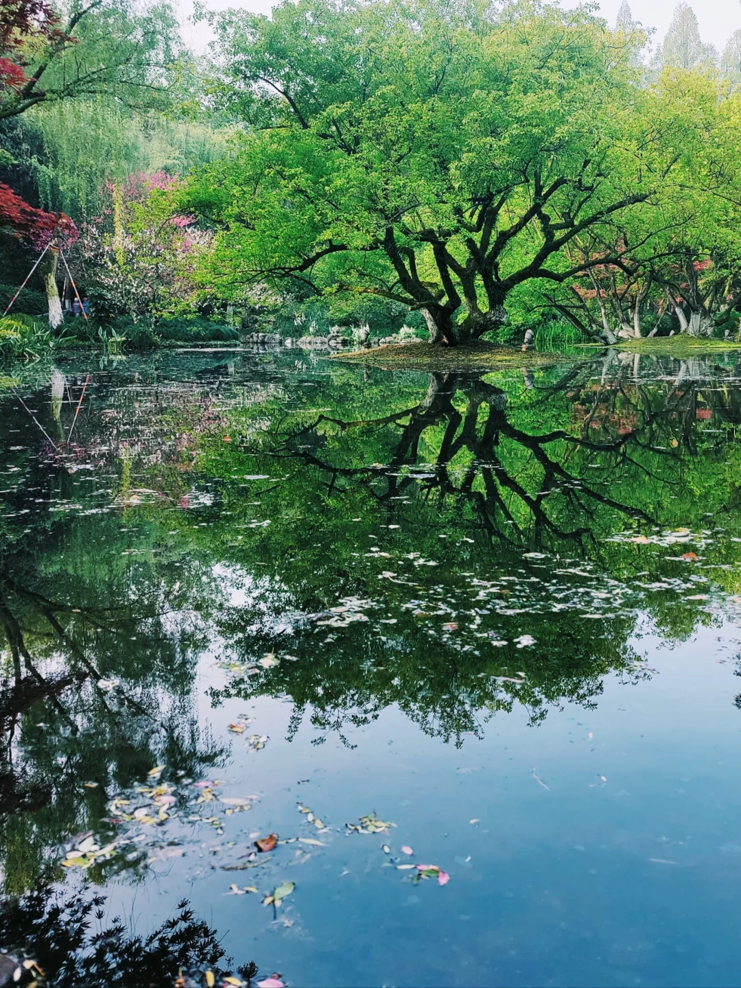 🎈柳浪闻莺:几个参天古树屹立于湖水镜面,折射出倒影,鸳鸯成双游于其间,记得去打卡隐藏在附近的横河桥,穿汉服打卡绝绝子.
