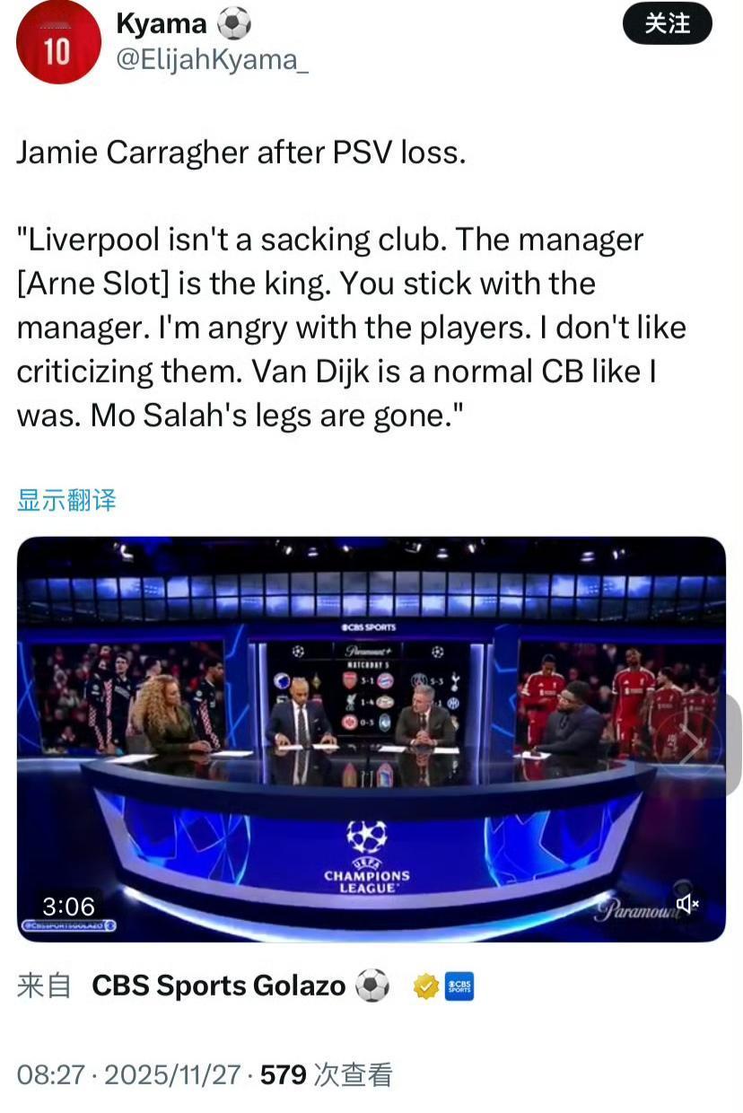 利物浦名宿卡拉格的三句话,我认为很有道理。 第一,利物浦不会轻易炒主教练,斯洛特还得执教。 第二,范戴克老了,沦为普通中卫,跟当年老了的他(卡拉格)一样。 第三,萨拉赫老了,双腿已经不行。 所以接下来利物浦再给斯洛特一段时间,然后范戴克再踢一年,萨拉赫太吃球权又老是丢球,恐怕埃及球王要离队! 去利雅得新月吧,去找努涅斯。[可怜]