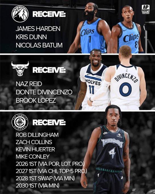美媒交易方案:快船三方交易得到4首轮,哈登联手华子! 今日,美媒APHoops分享了快船、森林狼和公牛的一笔三方交易方案!并配文:“三赢的交易!” 具体方案为森林狼得到哈登、邓恩和巴图姆;公牛得到里德、迪文琴佐和大洛;快船得到迪林厄姆、扎克-柯林斯、赫尔特、康利、26年首轮、27年首轮、28年首轮互换、30年首轮。 森林狼现在急于补充控卫位置,今年状态出色的哈登正好符合这个条件。哈登和爱德华兹的联手也很有希望冲击总冠军。 快船得到年轻球员迪林厄姆以及3个首轮和1个首轮互换,为重建做好了准备。而公牛得到了里德和迪文琴佐这样的即战力。这还真是一笔三赢的交易,希望真的可以达成。