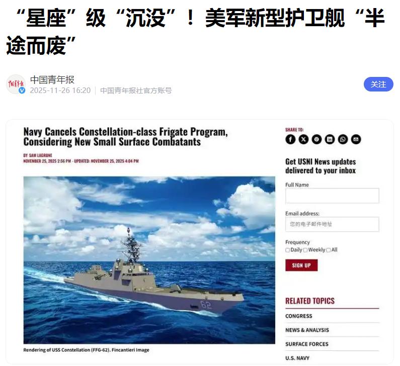 “美国海军姥爷们的天塌了!”   当地时间11月25日,一则消息让美国炸开了锅,海军正式宣布取消星座级护卫舰的后续建造计划,原本规划至少10艘的首批采购量,如今只剩已经开工的"星座"号和国会号两艘,其余订单全部砍光。   这个曾被寄予厚望的新型护卫舰项目,终究没能逃过美军装备发展"高开低走"的魔咒。回溯整个过程,星座级护卫舰从诞生起就命运多舛。   2022年8月首舰在威斯康星州马里内特造船厂开工时,美军还宣称要借助欧洲FREMM护卫舰的成熟设计快速形成战斗力,谁曾想后续修改会没完没了。   美国政府问责局的报告说得明白,海军不断提出特殊要求,动力设备、武器系统甚至上层建筑都大改特改,最终成品与原型的相似度只剩不到15%。   排水量从6890吨硬生生加到7490吨,长度增加7.2米,宽度也加了1.2米,原本26节的最大航速都受了影响,这已经不是升级改造了,和重新设计没什么区别了。   改动大带来的直接后果就是进度严重滞后。按照原计划,首舰本应在2026年交付,可到2025年春天,造船厂负责人承认实际施工进度才刚到10%,交付时间不得不推迟到2029年。   更离谱的是,开工三年后详细设计都没敲定,美国海军学会新闻网披露,这种"边设计边建造"的模式,和之前濒海战斗舰项目的混乱状况如出一辙,直接导致成本失控——已经投入的20亿美元打了水漂,国会批的76亿首批经费也眼看要不够用。   而星座级的夭折,只是美国海军当前困境的一个缩影。新舰造不出来,老舰的日子更不好过。就拿"哈尔西"号驱逐舰来说,2005年入役本该正值壮年,却被拍到炮管生锈、甲板污迹斑斑,《洛杉矶时报》曝光美国海军每年光因舰艇生锈就得损失至少30亿美元。   更要命的是人员短缺,政府问责局2024年的报告显示,海军缺员近1.4万人,63%的舰艇副指挥官坦言,人手不足让海上维修变得极其困难。   有水兵直言,能干的人都被累垮了,要么转业要么跳槽,形成恶性循环。像"艾森豪威尔"号航母,为了支持巴以局势在中东执勤超过200天,官兵们连轴转早已疲惫不堪。   如今的美国海军,正陷入"新舰交付难、老舰退役快"的两难境地。马里内特造船厂虽然还在赶工最后一艘濒海战斗舰,后续也只能靠建造基于濒海战斗舰的多任务水面战斗舰维持产能。   海军打算把省下的经费转投到所谓"更容易快速生产"的舰艇上,但从过往经验看,这种拆东墙补西墙的做法恐怕难成气候。   如果不能解决设计规划混乱、船厂工人短缺、维护体系崩塌这些根本问题,美国海军所谓的"重振雄风",大概率只能是原地踏步,未来怕是还要继续上演更多"天塌了"的戏码。