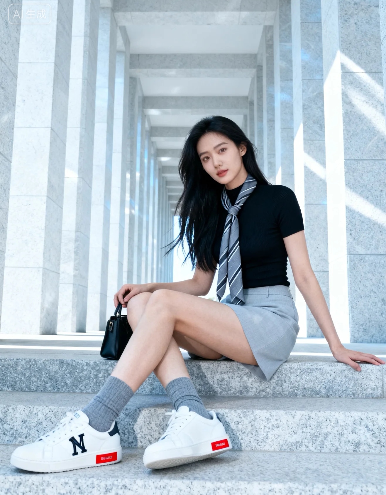 都市时尚少女,黑白条纹搭配,简约优雅。