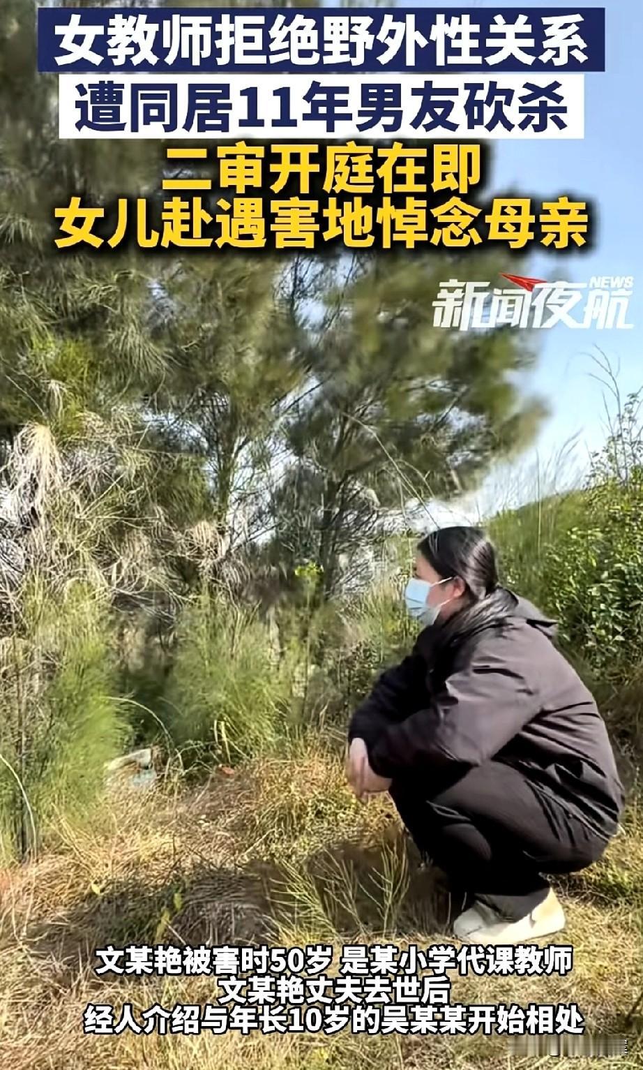 因拒绝野外性关系,被同居11年男友残忍杀害的广东女教师有3个子女,她早年丧夫,男友大她10岁,是经亲戚介绍认识的。见第一面时,家人对其印象都很好,想不到竟是如此残忍的恶魔,最终连性命都没能保住! 女教师姓文,殁年50岁,广东陆丰人,是当地一所小学的代课老师。 十几年前,文老师的丈夫因病去世,留下她和3个子女相依为命。几年后,经亲戚介绍,认识年长10岁的男子吴某,相互了解后,两人开始同居,直到案发,共持续了11年。 一开始,不管是文老师自己,还是子女们,都对吴某的印象不错,说话得体、待人很好。可慢慢的,一切都变了。 吴某经常对文老师家暴,身上伤痕累累,连周围邻居都亲眼见过好几次。 子女都有各自工作,不在身边,每次电话联系,文老师也是报喜不报忧。因此对于吴某的所作所为,孩子们全都蒙在鼓里。 如果说文老师有求于人或私德有亏,吴某找茬还有那么一丝丝理由。可实际上,2人住的房子都是文老师出资购买的,她本人也是品性优良、行为端正,是女儿心目中完美的人。 2024年8月,因为关系不和,文老师向吴某提分手,没想到对方思想不正,骑车将文老师带去山上,要求在野外发生关系后才同意分手。 荒郊野外的,周围还是一片坟地,这种不正常要求,相信任何女子都不会答应,文老师更是一口回绝。不曾想,吴某丧心病狂,直接用斧头将文老师砍杀,前后只用了16分钟。 普通人杀只鸡都觉不忍,面对相伴11年的枕边人,吴某竟如此“果决”,可见他是有多么的冷血无情。 另外,将人带到偏僻的山坡,还提前备好斧头,这说明吴某杀心早起。发生关系才分手估计也只是托辞,只要文老师坚持要分手,发不发生关系,结局估计都一样,毕竟豺狼嘴里的话是不能信的。 东窗事发后,吴某被抓,检方提请以故意杀人罪追究其刑责,一审如家属和众多网友所愿,吴某被判死刑! 故意杀人是八大重罪之首,尤其是无缘无故以如此残忍的方式杀害亲友,判处死刑是其罪有应得。 然而,吴某不甘心面对死亡,他提出上诉,二审于今日(11月27日)开庭。 文老师遇害后,3个子女的天塌了,她的父母仍然健在,孩子们不敢告诉姥姥姥爷,晚年丧女、白发人送黑发人的锥心之痛,老两口估计万难承受! 纸包不住火,女儿的噩耗他们迟早会知道,如今只有将吴某严厉判决、明正典刑,才能稍稍安抚家属们内心的悲痛…… 【关注@小讼言案 ,为您分享更多精彩】 (来源:新闻夜航)