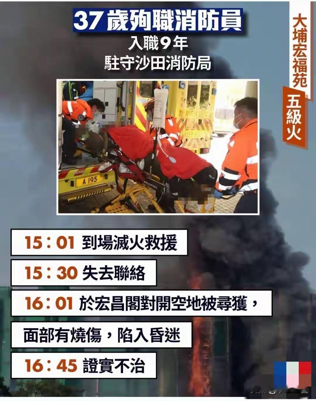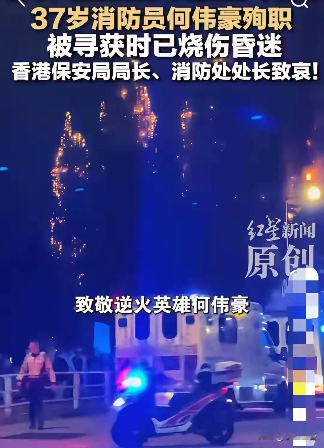 这才是,香港火灾最痛心的一幕 整整12个小时,大火终于扑灭了,700多名消防员,熬着通宵跟大火对抗,128辆消防车连轴转,但还是失去了44条生命。 悲剧,没有幸免。 37岁的何伟豪,冲进火海救人后就失联了,等找到他时,浑身已经重度烧伤,送到医院抢救,还是没能留住他,更让人痛心的是,之前人爆料,还有10天,他就要结婚了。 多么鲜活的一条生命,他的女友该有多痛心。 工作9年,救出了那么多人,没想到,自己却倒在热爱的工作上。 此次的着火点,原本是在低楼层,但由于外面密密麻麻的竹手架,大火很快就蔓延了,导致连着的8栋楼全都烧了起来,为了省钱,香港基本都是竹子做的脚手架,一旦失火,真的是“助燃剂”,停都停不下来。