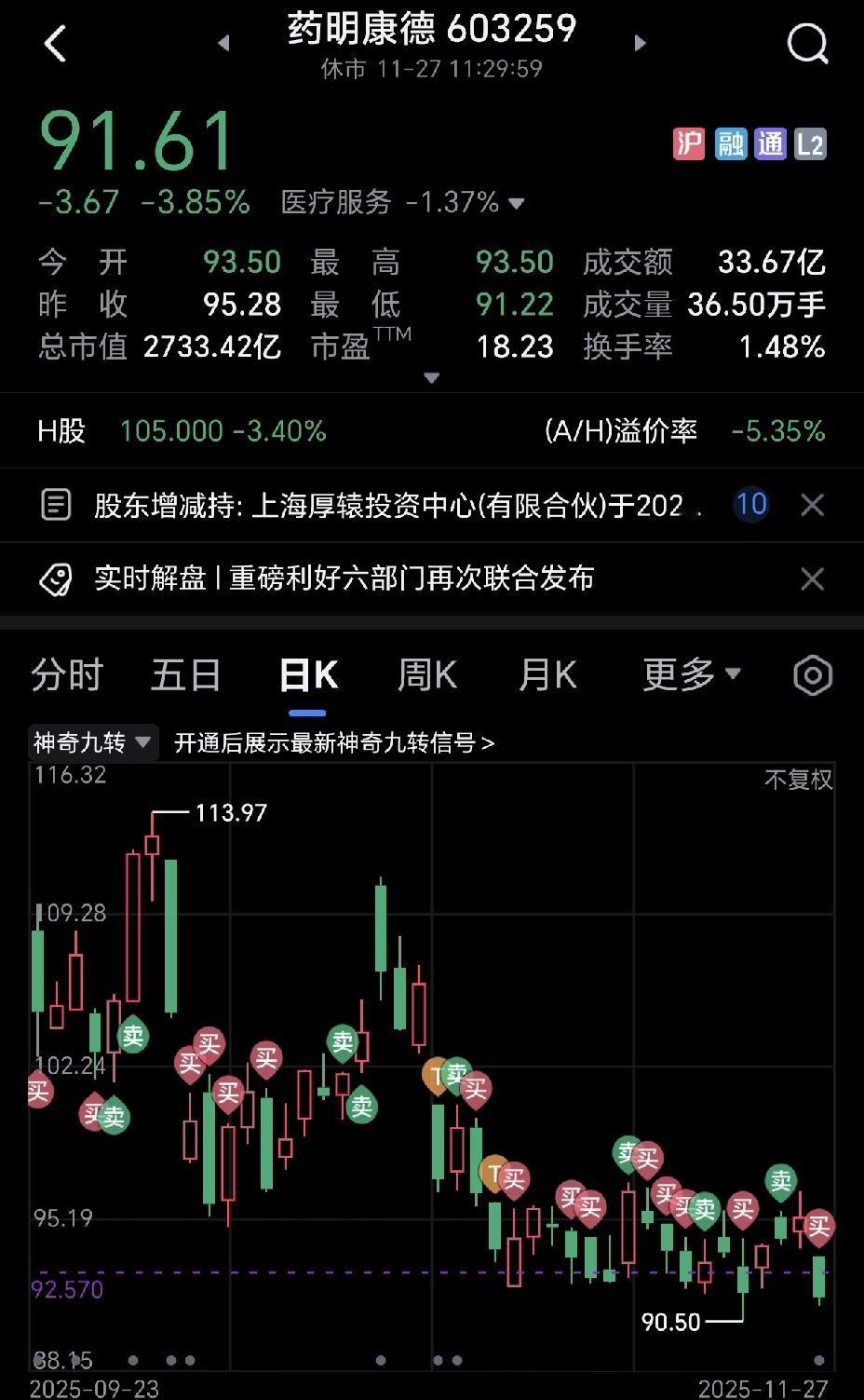 药明康德应该是医药界最渣的一只股票,没有之一。 一众股民对他是又爱又恨,这老哥动不动就玩减持,如果没有减持,股价要上了120元了,多少散户被套在里面。 昨天这只股票还好好的,主力也有买入的动向,没想到今天直接三个点的跌幅,原因是又玩减持了太坑人了。 简直就是医药界的渣男! 大家对此怎么看?