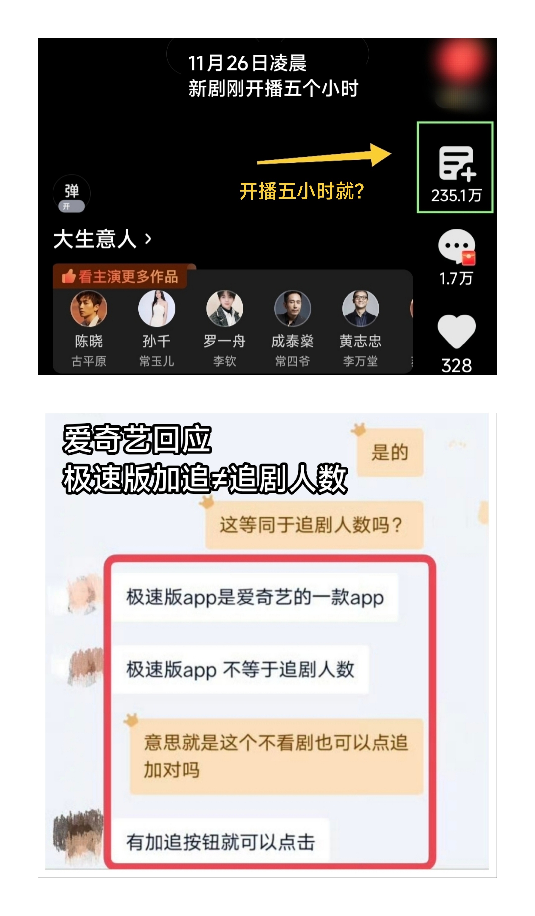 爱奇艺极速版加追 果然是不可信的,无用的数字吧?参考爱奇艺昨天新剧。刚开播几个小时就显示235w加追,现在过了一天多,只涨到了236w加追。。证明根本不是追剧人数,不然难不成一天多只有1万人追剧?