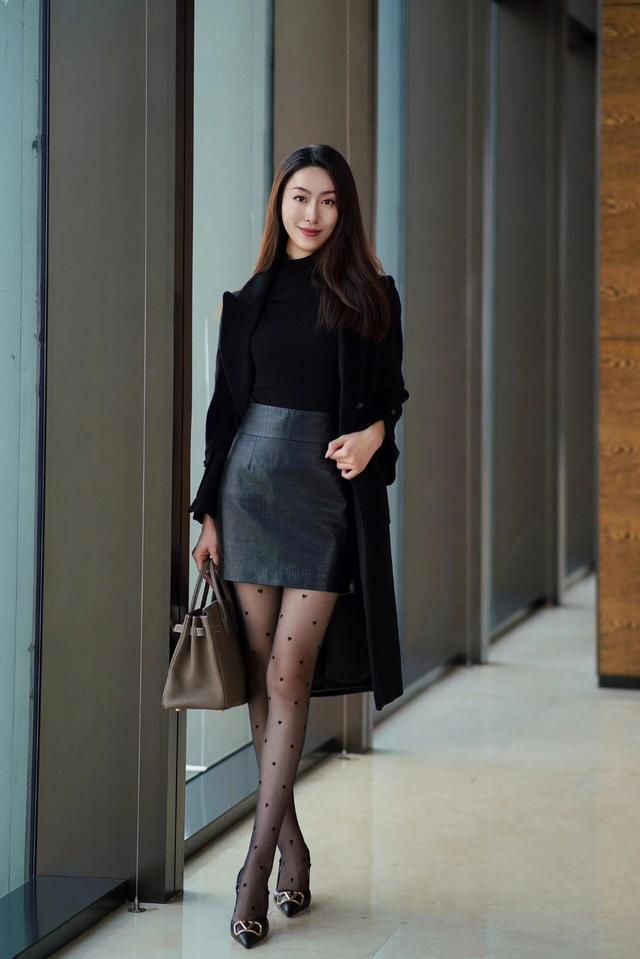 这套穿搭是「性感轻熟风」的代表~黑色皮质连衣裙自带酷飒质感,收腰包臀的中长版型勾