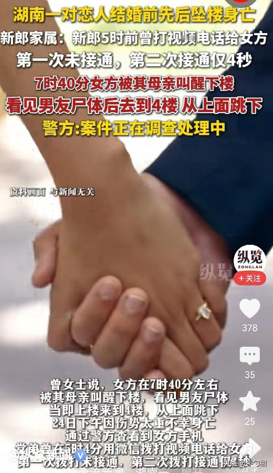 现代版“殉情”没想到真实发生了,近日在湖南,一对恋人都在着手准备着婚礼,即将步入两个人的婚姻憧憬了,可没想到,双双坠楼。 事发来的太突然了,准新娘早晨被母亲叫醒,下楼突然发现了新郎的尸体,承受不住打击的她,第一时间返回楼上,在同样的位置,选择和新郎一起同生共死的承诺。 这不是梁山伯与祝英台的爱情吗?据周围邻居说,他们两个很是相爱,双方条件都不算差,还一起经营了一家早餐店,很是受大家的喜欢,知道他们喜事连连,邻居都是很祝福他们,甚至早餐店都还挂着“囍”字。 事后调查,新郎由于醉酒,没想到失足坠楼身亡,更没想到新娘不带半点犹豫,看到新郎的离世,直接选择了和他同样的路。 两个人在人世间没有相伴一生,但是在某个属于他俩的地方,注定陪伴着彼此,一生一世。 (图片来自网络视频)