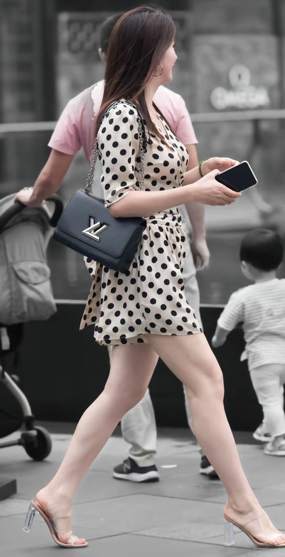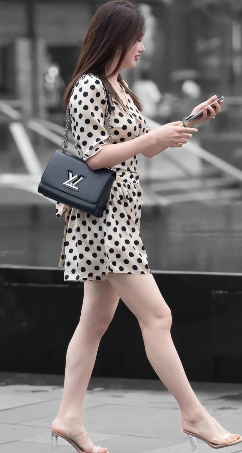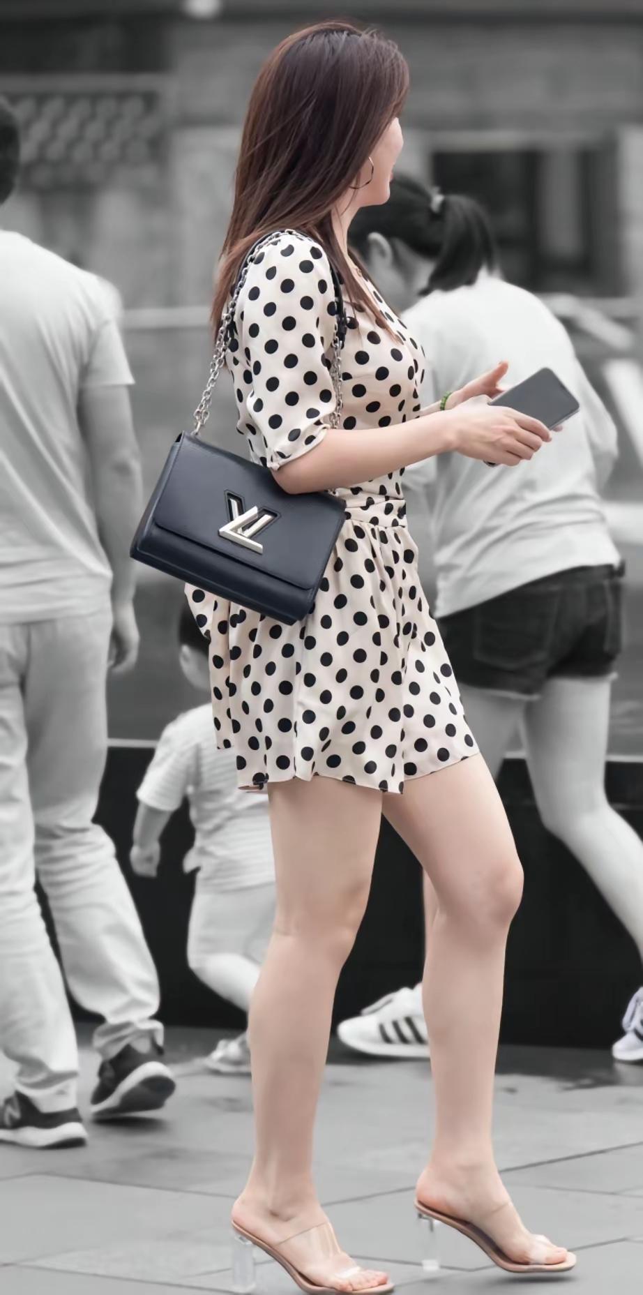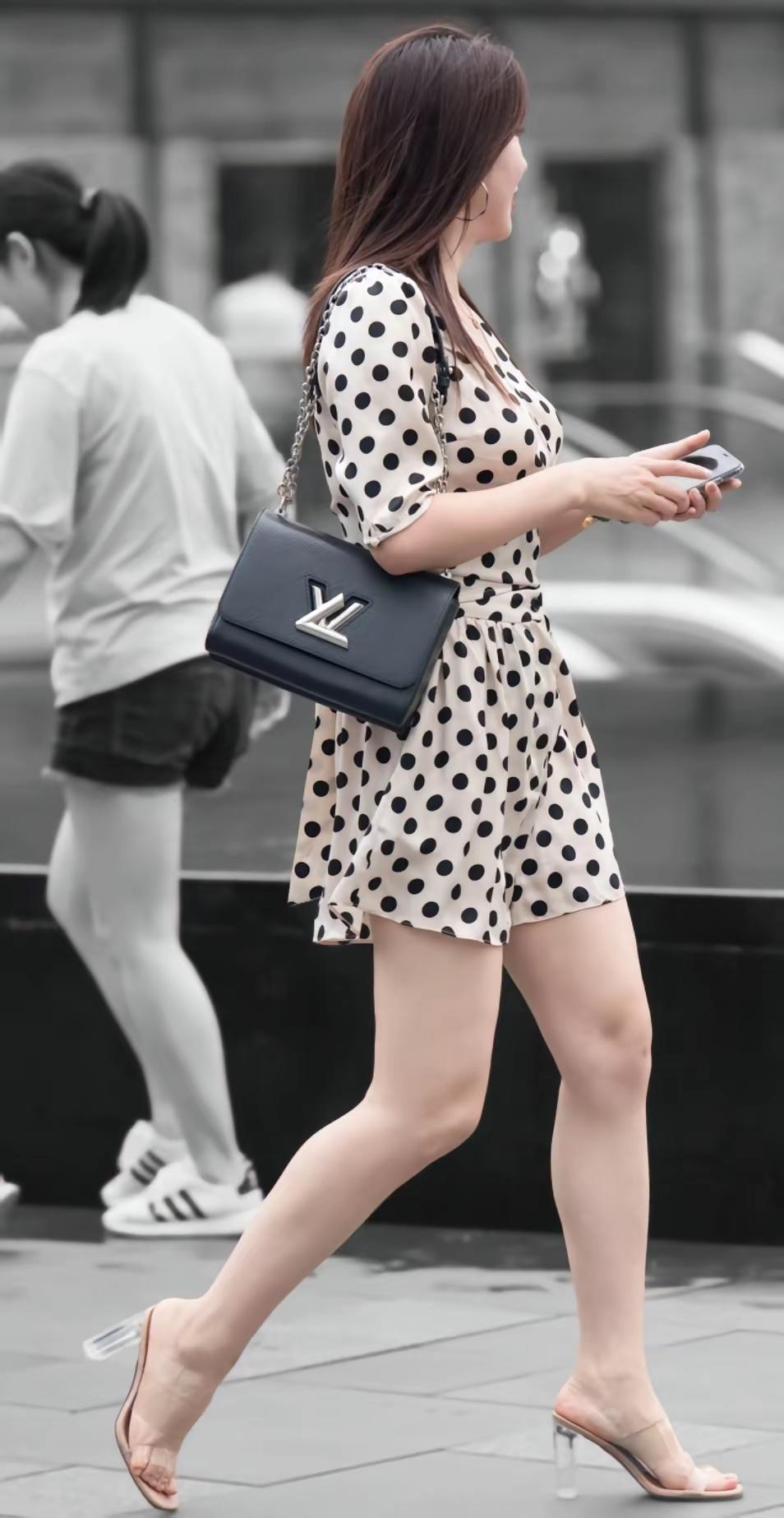 女人的气质穿搭,核心是“简约中带细节”。像图中这种波点连体裤就很讨巧:经典波点自带复古优雅感,收腰+短裤版型既显腰线又利落;搭配极简透明高跟鞋,弱化厚重感,让线条更轻盈。 配饰不用多,一只质感包包就能提气场——深色包与波点的黑白调呼应,金属扣又添精致度。重点是“风格统一”:复古元素+利落剪裁,既不会太甜腻,也不会太刻板,松弛又有分寸感。 气质从来不是堆砌元素,而是“选对风格+适配身形”,舒服自在的同时,让单品替你说话。