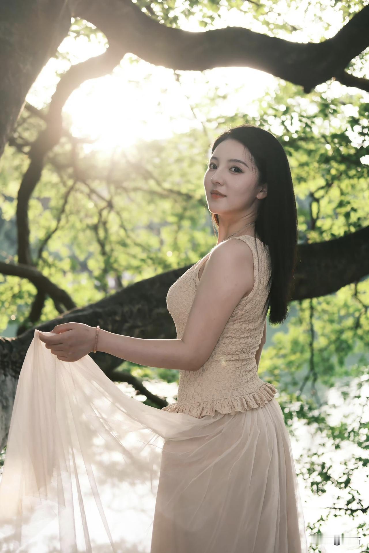 树影婆娑水色柔,浅杏裙裾韵难收。 流光吻过香肩处,万种风情画里留。