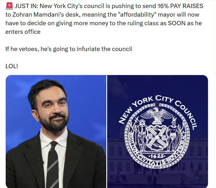 纽约市议会正在推动一项16% 的加薪提案送到佐兰·曼达尼办公桌上,这意味着这位所谓“关注可负担性”的市长一上任就必须决定是否要给统治阶层更多的钱。 如果他否决这一提案,他将激怒市议会。
