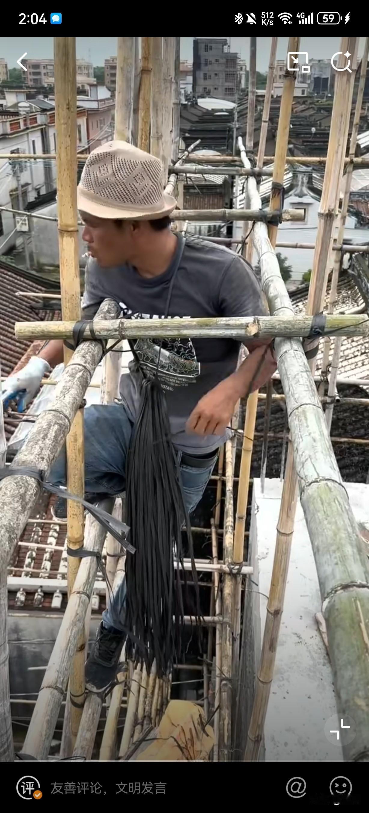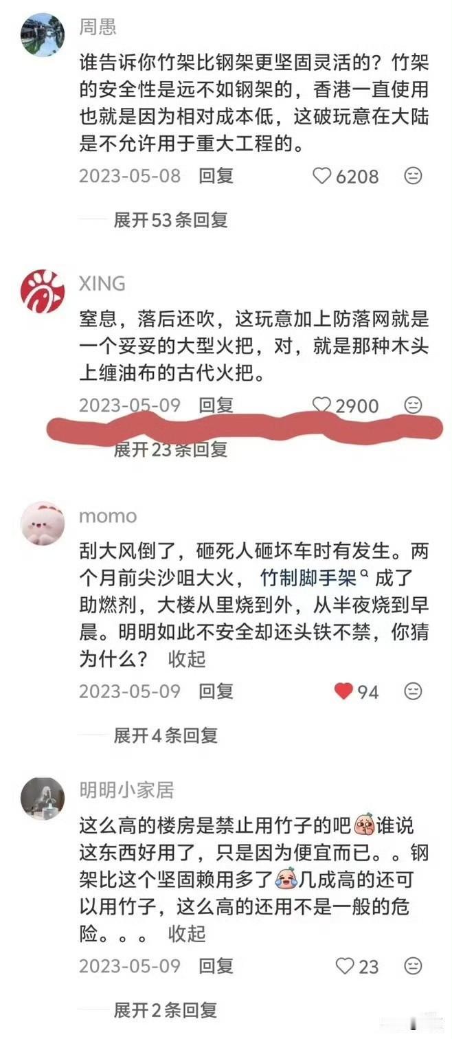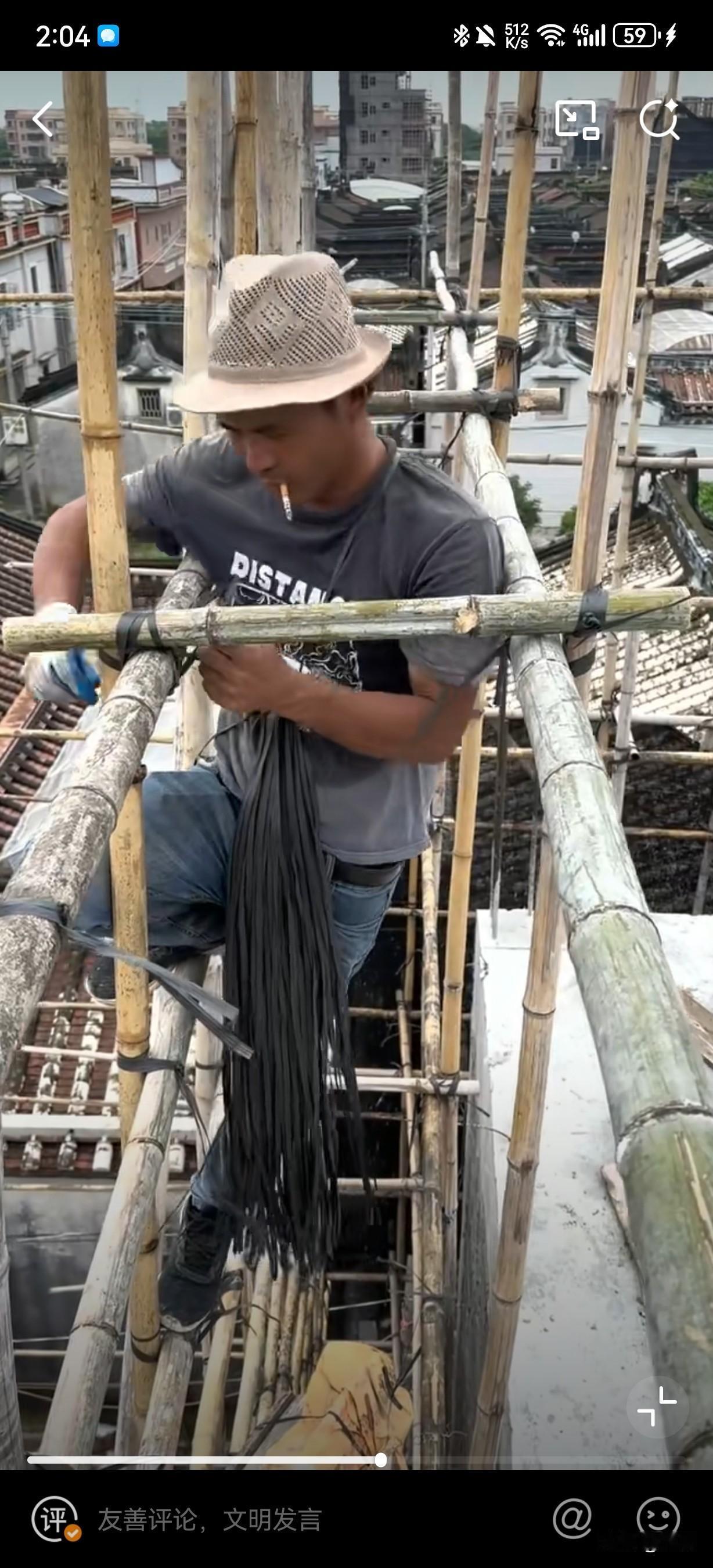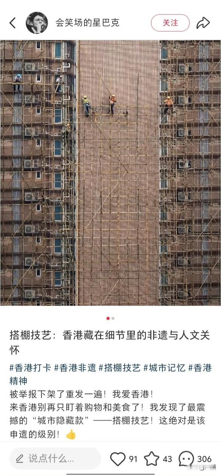 最后吐烟头的动作,解释了一切… 香港都是这种竹子的脚手架,工作量很大,容易着火,效率不高……弊端很多。 但在小红薯上,香港的搭棚技艺,也就是竹制脚手架,被吹捧上了天,就差申遗了!