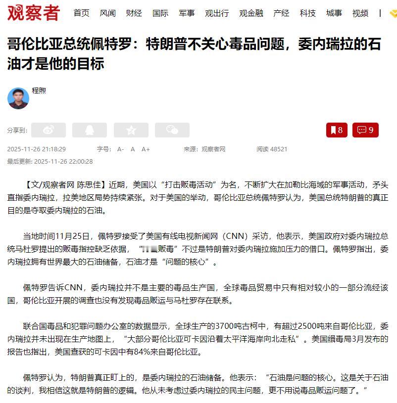 11月25日,哥伦比亚总统佩特罗的CNN采访直接引爆舆论!特朗普11月刚往加勒比海重兵集结,高调喊着“严打贩毒”,却连马杜罗涉毒的半分实锤都拿不出。佩特罗当场戳破真相:特朗普根本不在乎毒品问题!他重兵压境的真正目标,分明是委内瑞拉那全球第一、超3000亿桶的石油储备,这出“禁毒”大戏,从根上就是冲着资源来的! 最能说明问题的就是美国对委内瑞拉制裁的反复无常。2022年俄乌冲突让能源市场紧张,美国立马放松制裁,给雪佛龙公司发许可证,允许它恢复在委内瑞拉的石油开采和出口,甚至让委原油运往美国炼油厂。 可这放松根本不是出于善意,许可证里明确规定,委内瑞拉国家石油公司不能从销售中获利,等于让美国企业白拿资源。 到了2024年,因为委内瑞拉大选的事没顺着美方意思,美国又立刻重启制裁,把委石油行业重新按下暂停键。 这种跟着自身利益变来变去的操作,哪里有半点“禁毒”的诚意,分明是把制裁当工具,拿捏委内瑞拉的石油命脉。 美国所谓的“禁毒理由”,早就被自己的行为戳穿了。今年9月,美国干脆取消了哥伦比亚的全球禁毒合作伙伴资格,理由是“未能履行禁毒义务”。 可佩特罗直接拿出实锤:哥伦比亚禁毒成果摆在那,美国这么做纯粹是政治打压,因为哥伦比亚不愿跟着美国的节奏针对委内瑞拉。 国际社会早就看穿了美国的图谋。联合国人权专家小组直接发布报告谴责,说美国在委内瑞拉的军事行动违反《联合国宪章》,是侵犯主权的非法行为,还指出美国所谓的“反恐禁毒”根本没有法律依据。 美洲玻利瓦尔联盟也站出来发声,痛斥美国捏造不存在的“太阳集团”,给委内瑞拉扣上“恐怖组织”帽子,本质就是为政权更迭和掠夺资源找借口。 墨西哥总统也明确表态,坚决反对美国干涉他国内政,这些国际声音凑在一起,早就把美国的谎言戳得千疮百孔。 佩特罗之所以敢直言不讳,是因为他看透了美国的霸权逻辑。美国一边指责别人禁毒不力,一边却把禁毒当成打压异己的工具,不顺从的国家就取消合作资格、实施制裁。 而委内瑞拉拥有超过3000亿桶石油储备,这么大一块肥肉,美国自然不会放过。它想通过军事威胁、制裁施压,逼迫委内瑞拉就范,最终让其石油资源为自己所用。 说到底,美国的这套霸权套路早就过时了。在全球化的今天,每个国家的主权都该被尊重,资源也该由本国人民自主掌控。 美国以为靠武力威胁、虚假指控就能掠夺资源,却忘了国际社会的眼睛是雪亮的,联合国的谴责、拉美国家的反对,都是对这种霸权行为的抵制。佩特罗的发声,不仅是揭露真相,更是在捍卫拉美国家的自主权利。 历史已经证明,任何试图靠强权掠夺资源、干涉他国内政的行为,最终都会遭到反噬,美国若不及时收手,只会在霸权的泥潭里越陷越深。