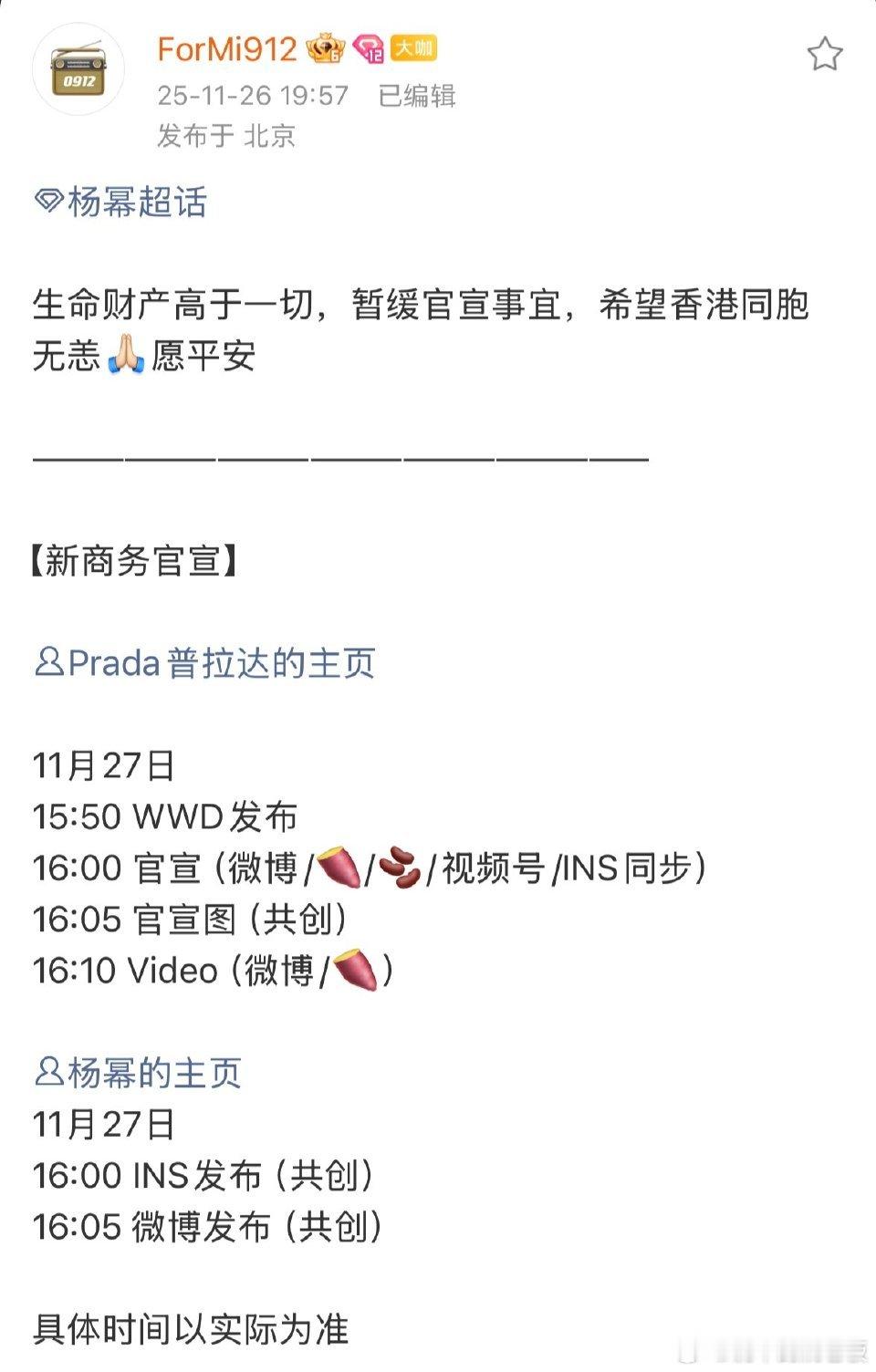 杨幂暂缓官宣这波格局太圈粉了!香港火灾当前,果断连夜联系暂缓Prada官宣,把公共关切放在首位。曾为国家主权果断解约问题品牌,多年深耕公益帮扶困境儿童,她的善意从不是作秀。 顶奢代言可等,民生为重不能等,用行动诠释了何为公众人物的责任与担当!