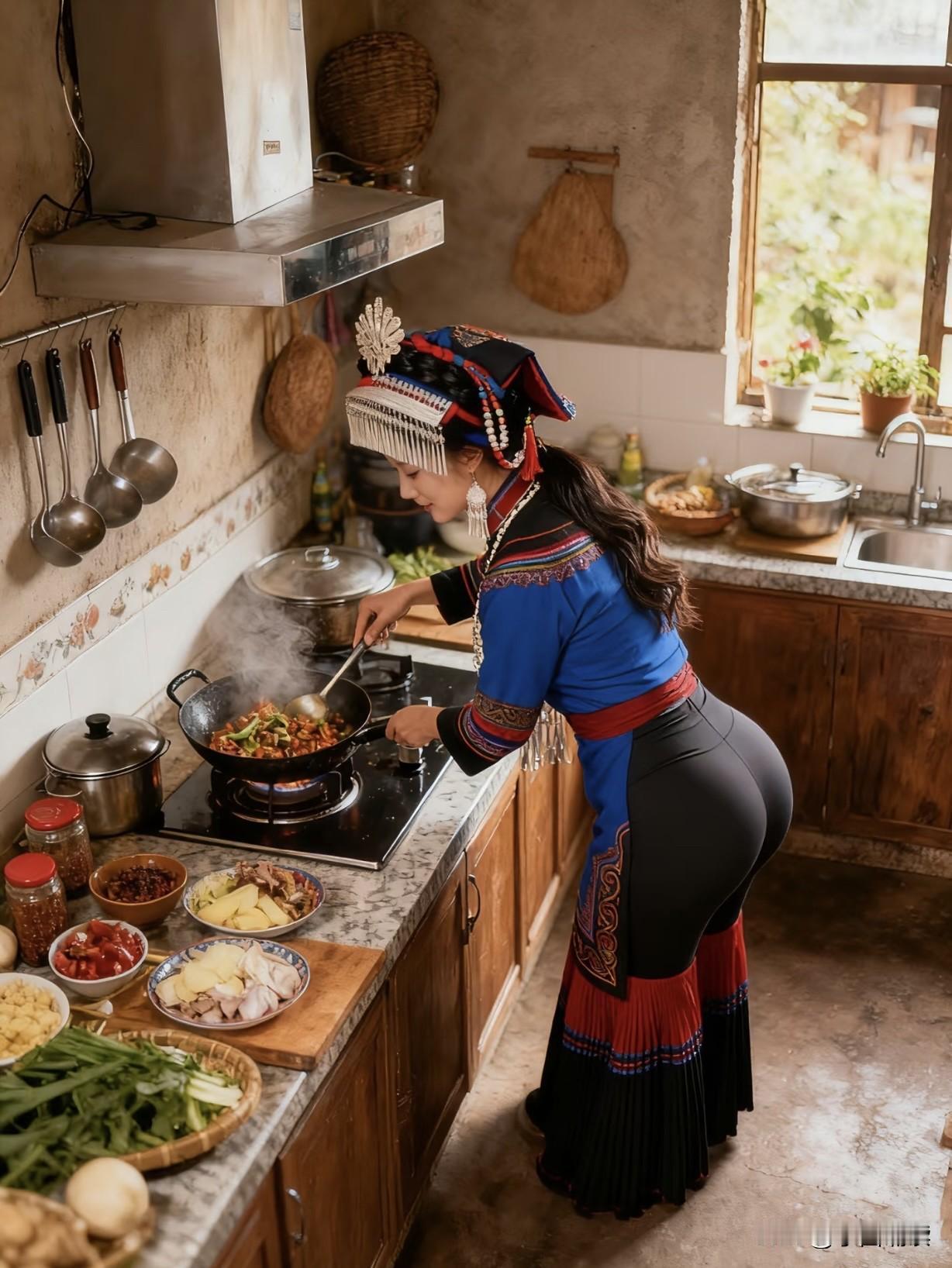 哇,彝族的姑娘做饭都要穿得这么性感漂亮吗?这饭菜看着真让人眼馋啊!